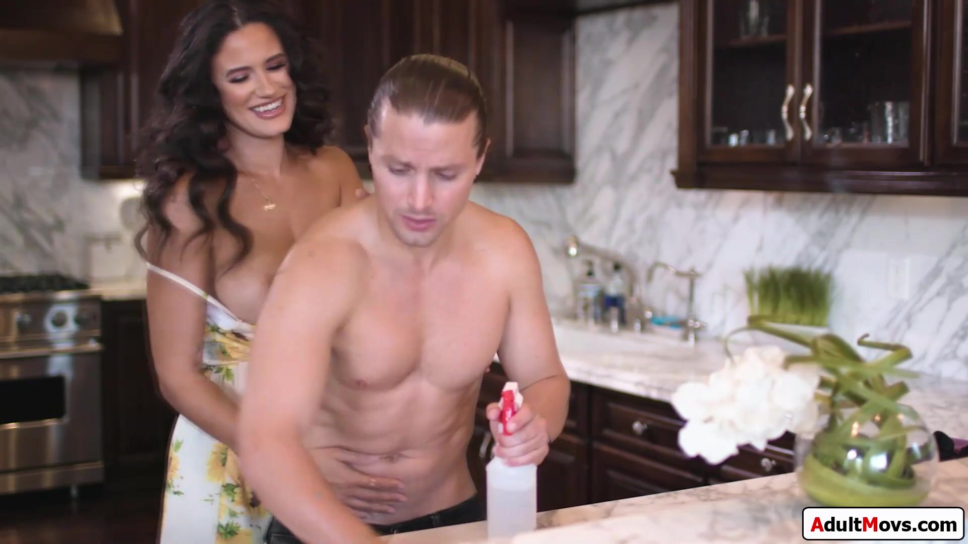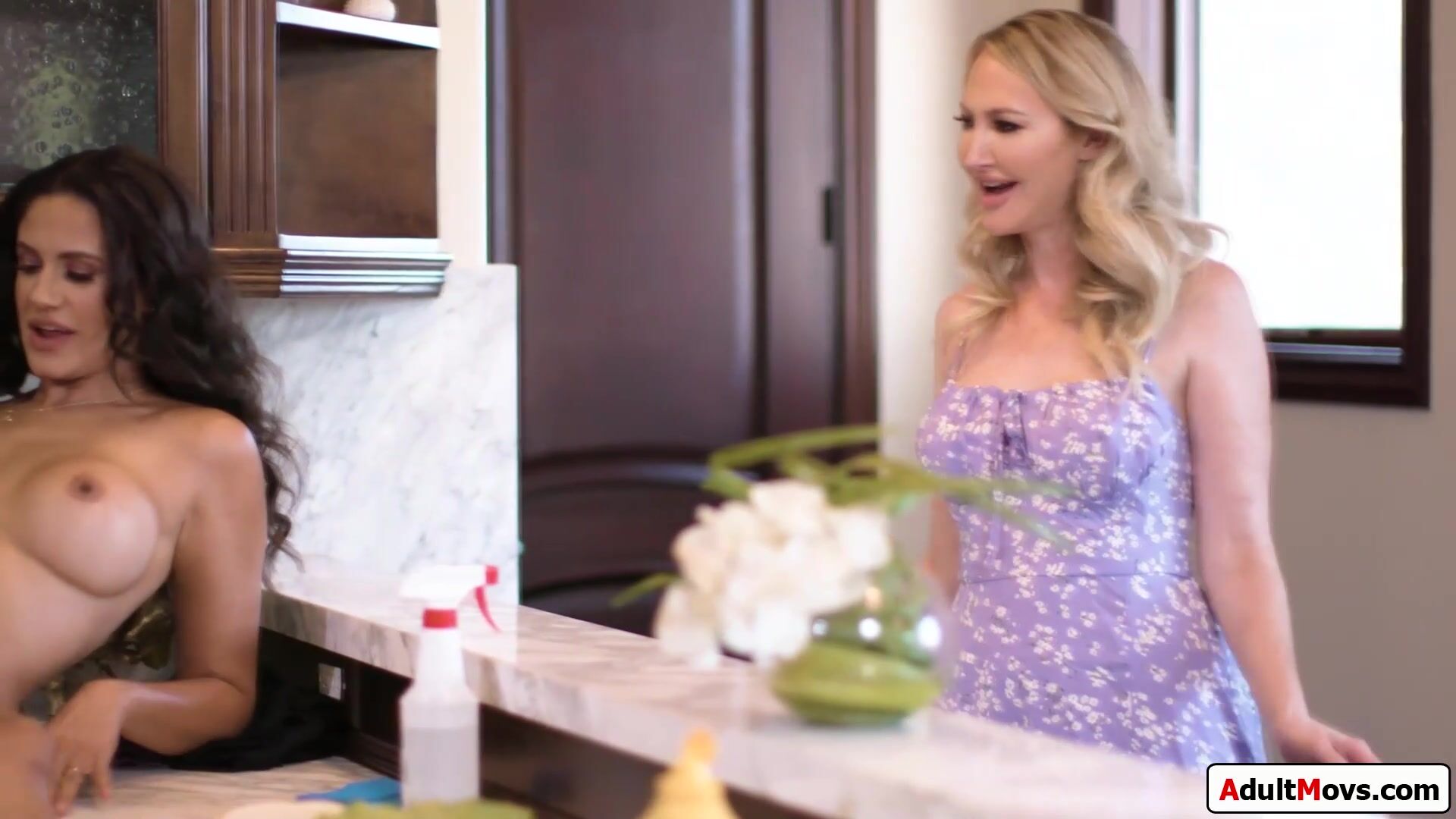 Big tits stepmom gets frisky with stepson while he is doing his chores.The busty milf sucks cock and gets her pussy licked when her friend walks in.She is please to see the new technique is working and watches her gf rides her stepsons big cock