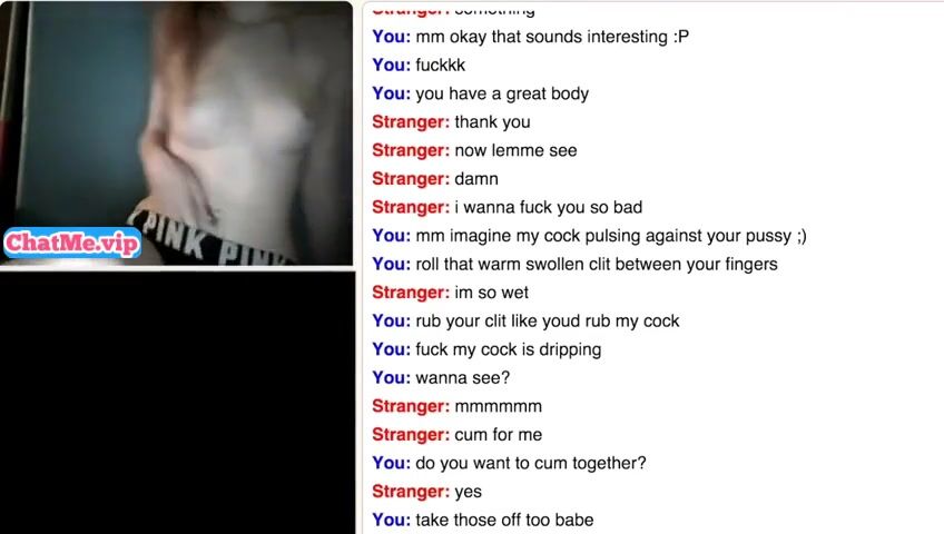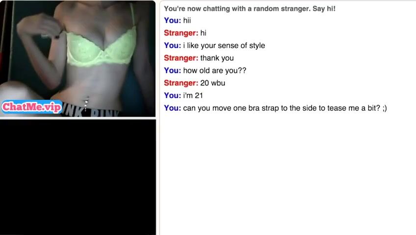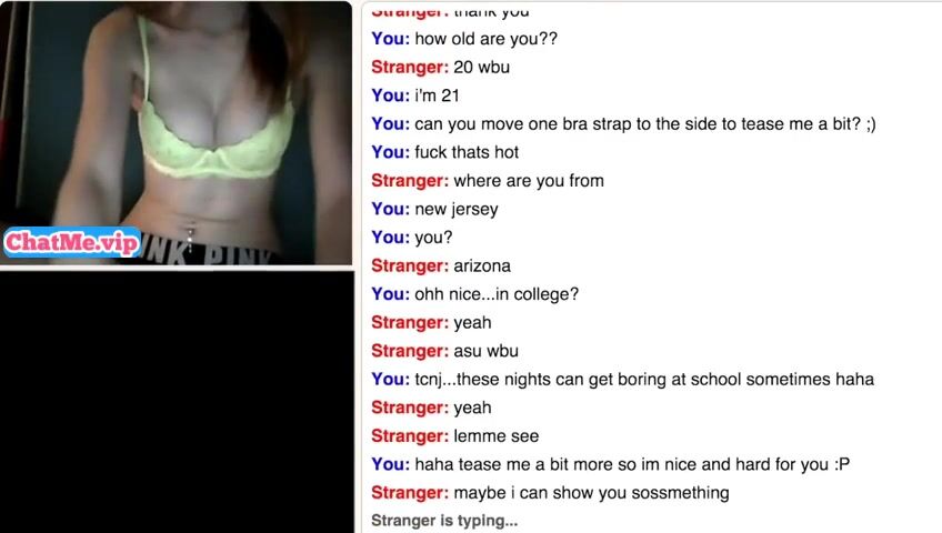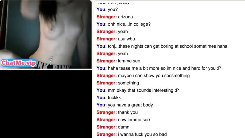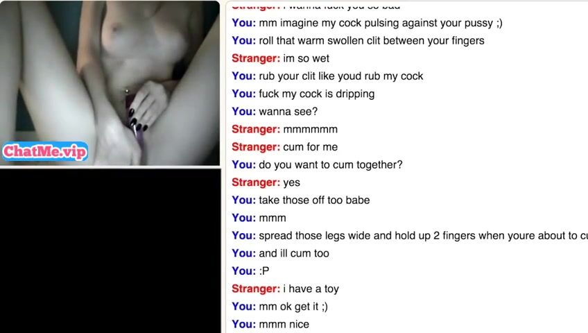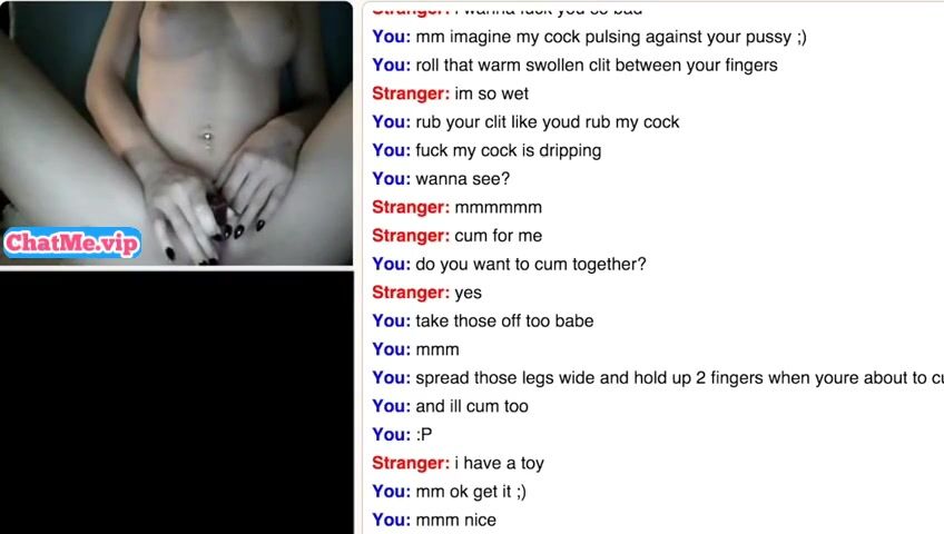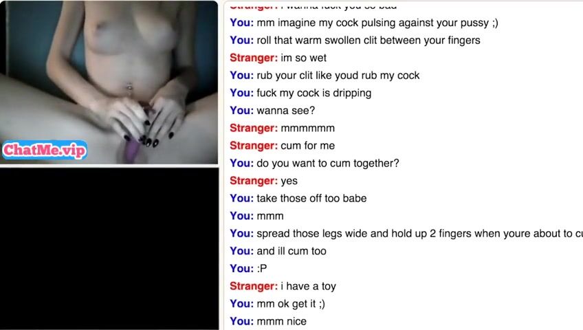 Slender young babe masturbating with a stranger guy while chatting. She is staying completly naked,showing her sexy young body with belly piercing and small tits.