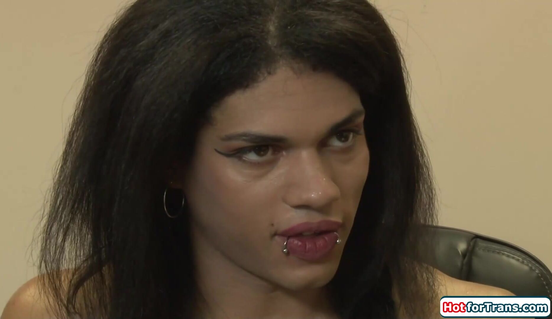 Busty ebony trans boss Morena Black confronts her employee with his gloryhole adventure.The big tits black shemale makes him suck her big tgirl cock.The brunette ts deepthroats his big dick.The tranny wants him to anal fuck her in the ass