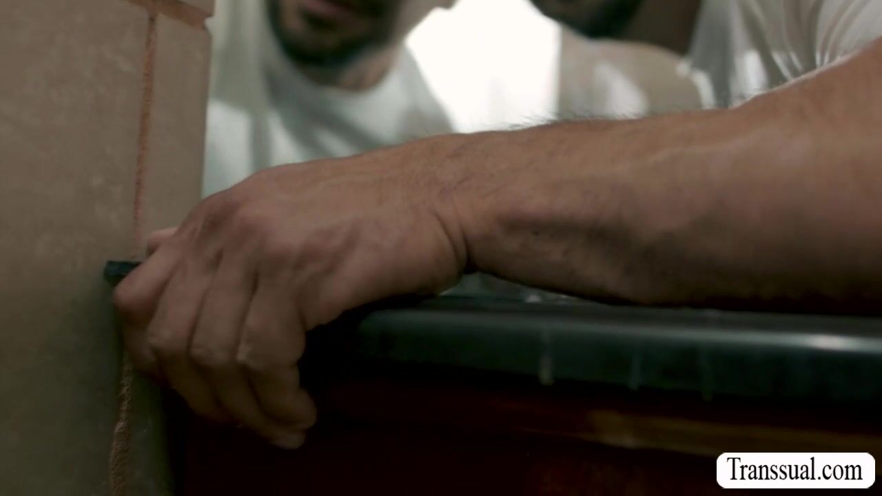 Masturbating TS caught her stepbro watching and instead of getting mad,she grabs him inside the bathroom and lets him suck her hard shecock passionately.In return,she licks his big ass first and she then fucks it so deep and hard.