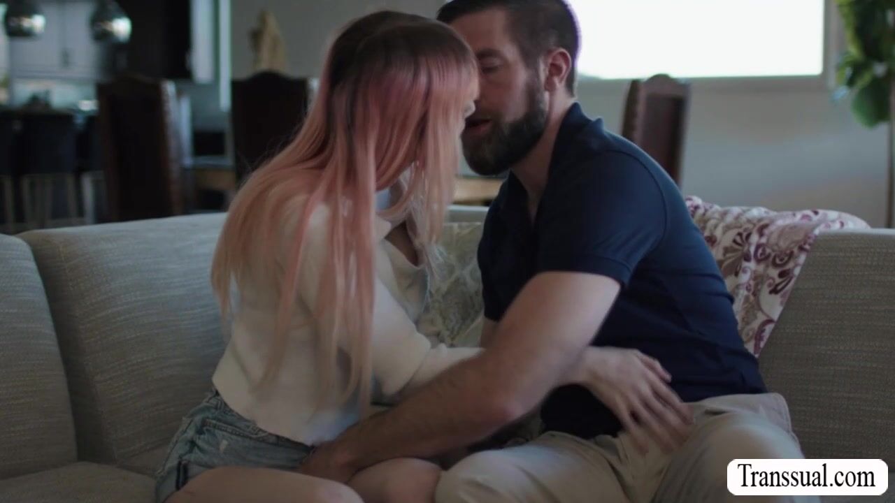 Stepdad and his busty pink haired TS stepdaughter are on the couch kissing each other passionately.After that,he lets her throat his hard big cock passionately and in return,he fucks his TS stepdaughters ass so deep and hard.