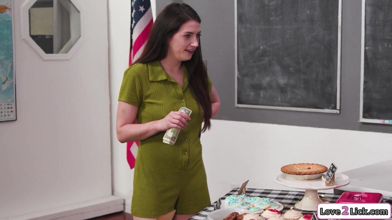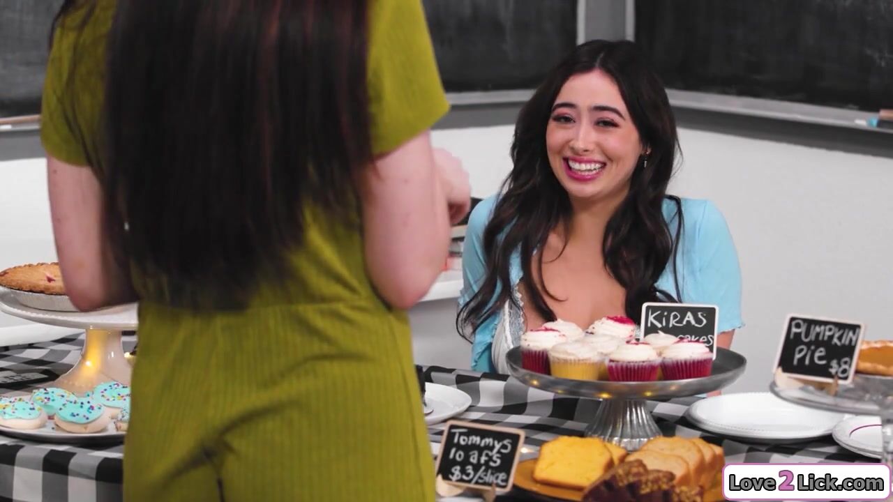 Busty stepmom licks curvy stepdaughter hairy pussy under a table so she sells more cakes.The blonde milf sucks her big tits and the brunette gives her oral sex as she fingers her cunt.Then the older woman asslicks the babe as she masturbates her cunt