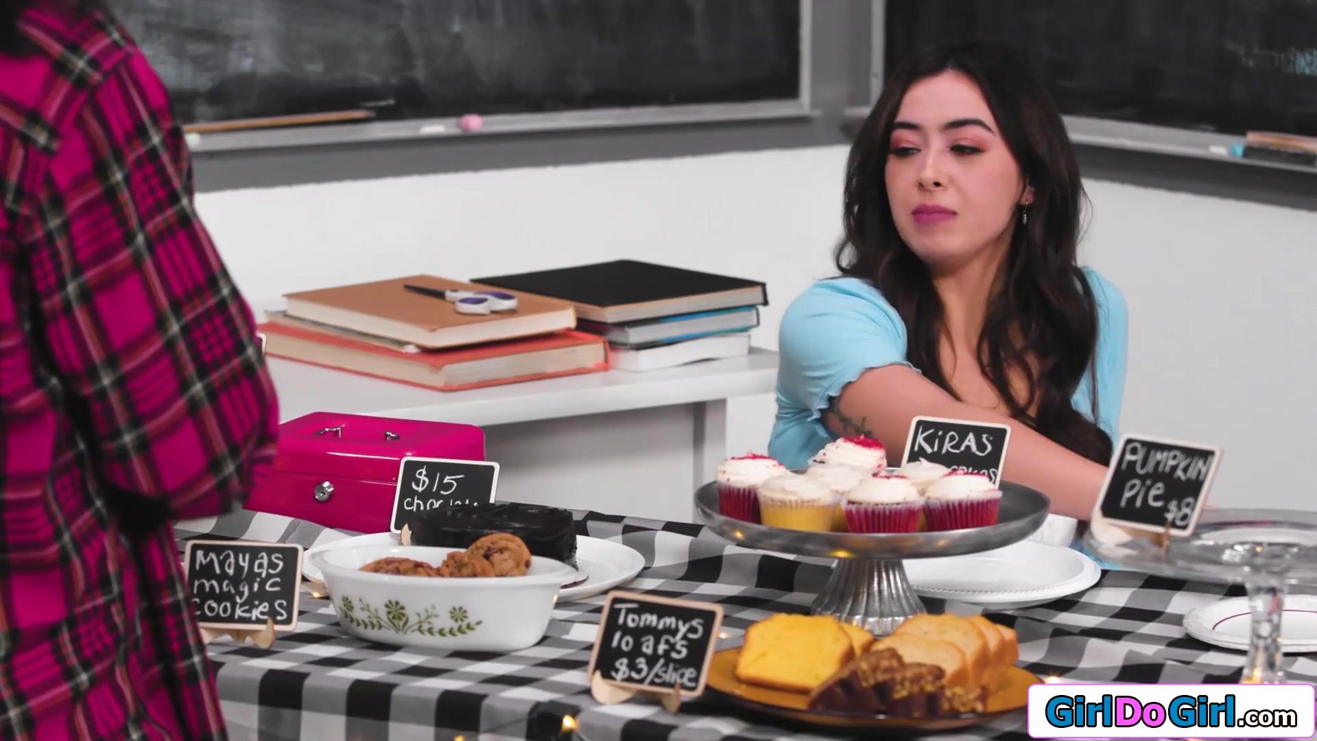Busty stepmom licks stepdaughter under table during bakesale