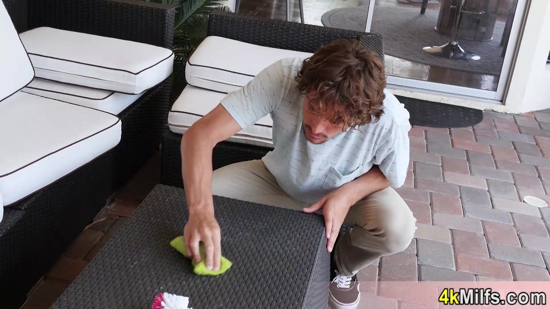 Hot brunette mature housewife Melissa Lynn flashes her big fake boobs to the cleaning gux and the neglected slut asks him to fuck her neglected MILF pussy hard but first she wants to taste his big cock so she gives him a blowjob