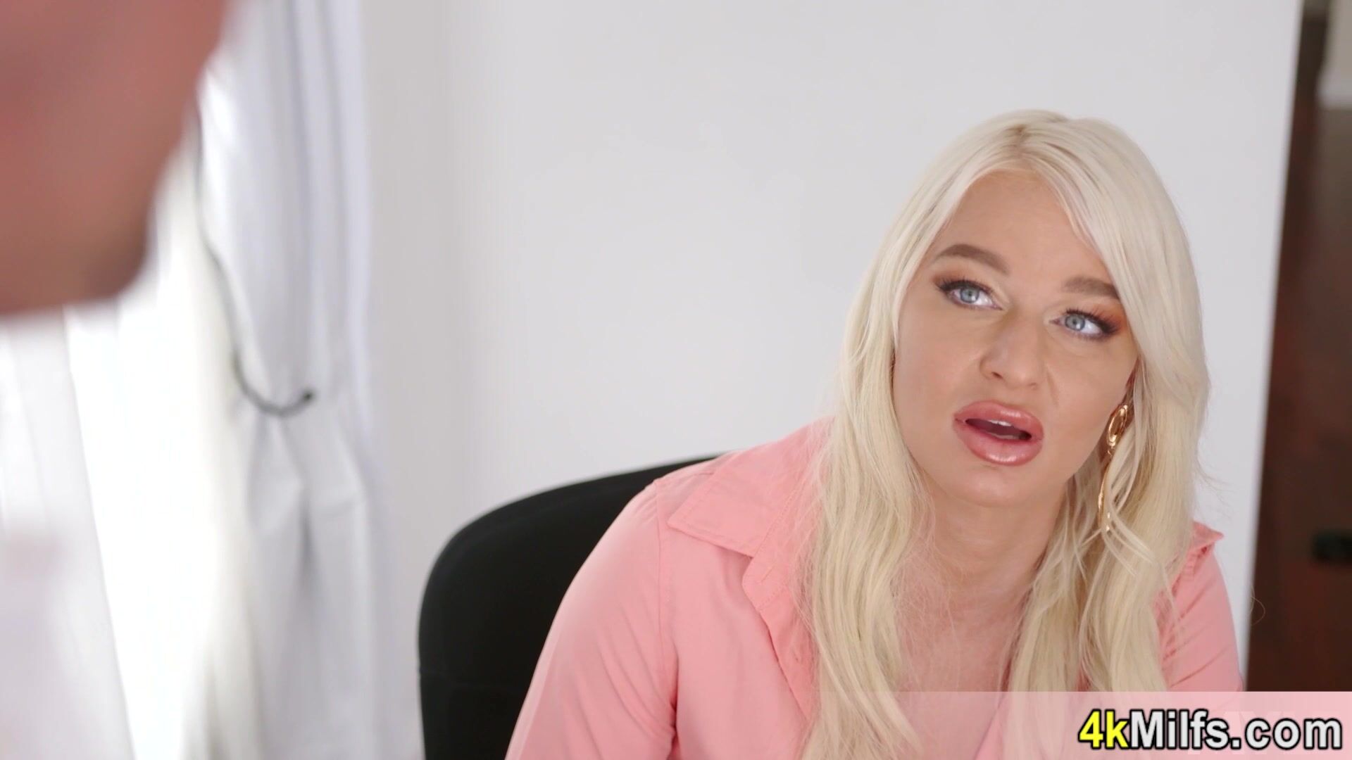 Blonde mature boss London River with big natural tits ordering her shy intern to satisfy her powerful pussy She is sucking his big cock then orders him to fuck her hungry cunt hard