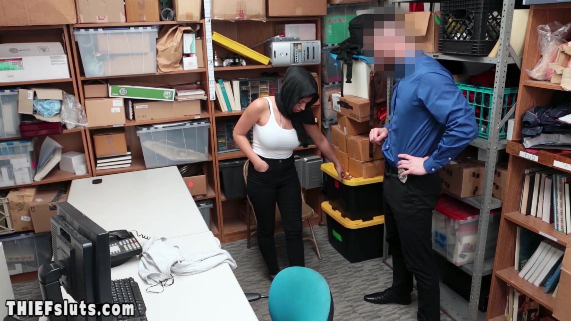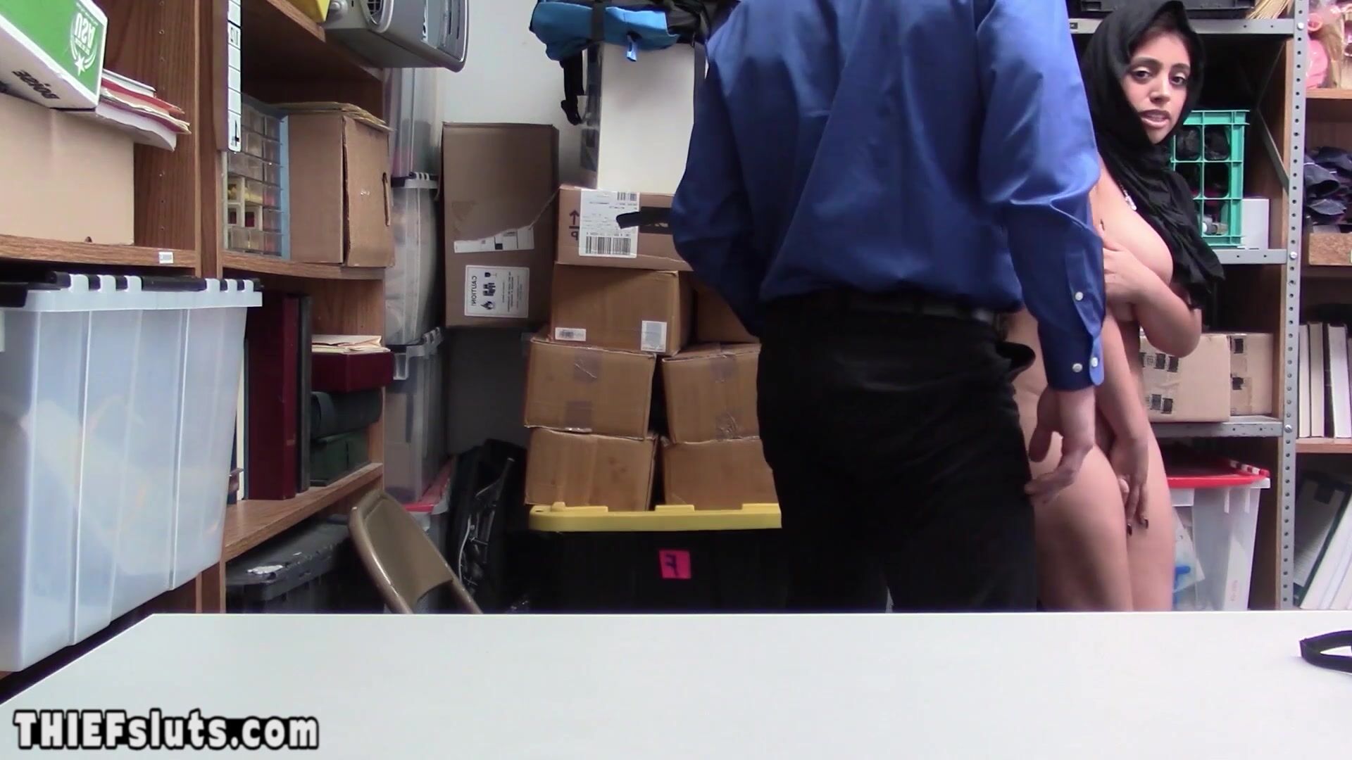 Scared arab teen thief Ella Knox with big natural tits gets caught by a horny LP officer and she has to pay for her sins on his big white cock He orders her to suck his dick then he is fucking her hard