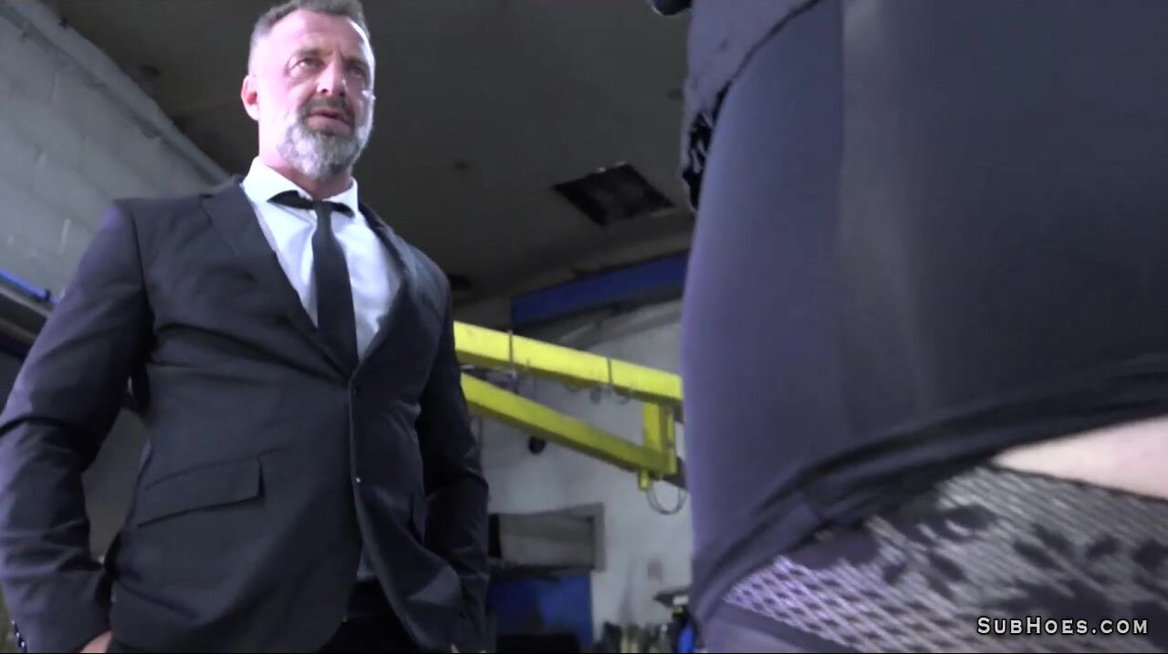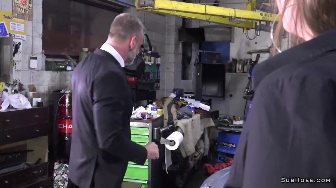 Sexy and horny slut Alice Maze in black lingerie enjoys amazing rough anal with a lot of spanking while she gets shuge dildo toy with cumshots and she gives blowjob on hard cock in car repair service