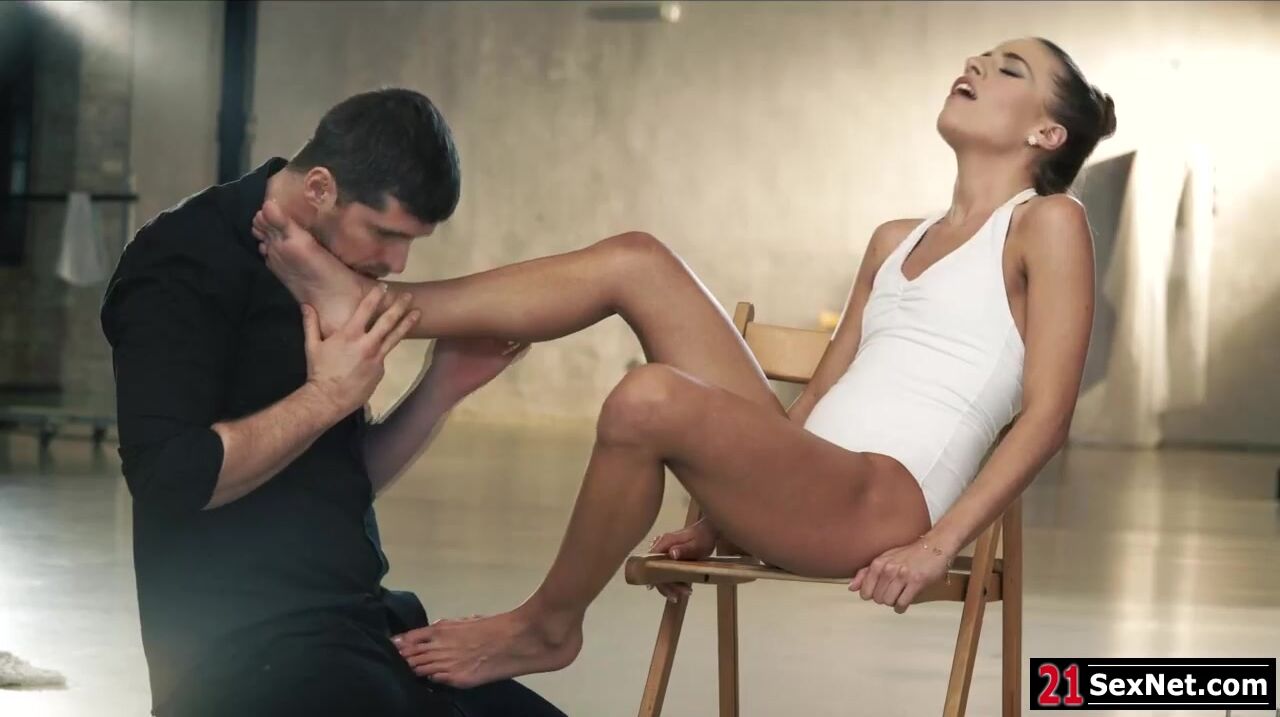 Brunette italian Eveline Dellai flaunting her foot and letting her guy Kristof Cale suck her toes.She gives him footjob before sucking his big cock.The guy slowly fucks her shaved pussy while the petite european babe is masturbating her clit.
