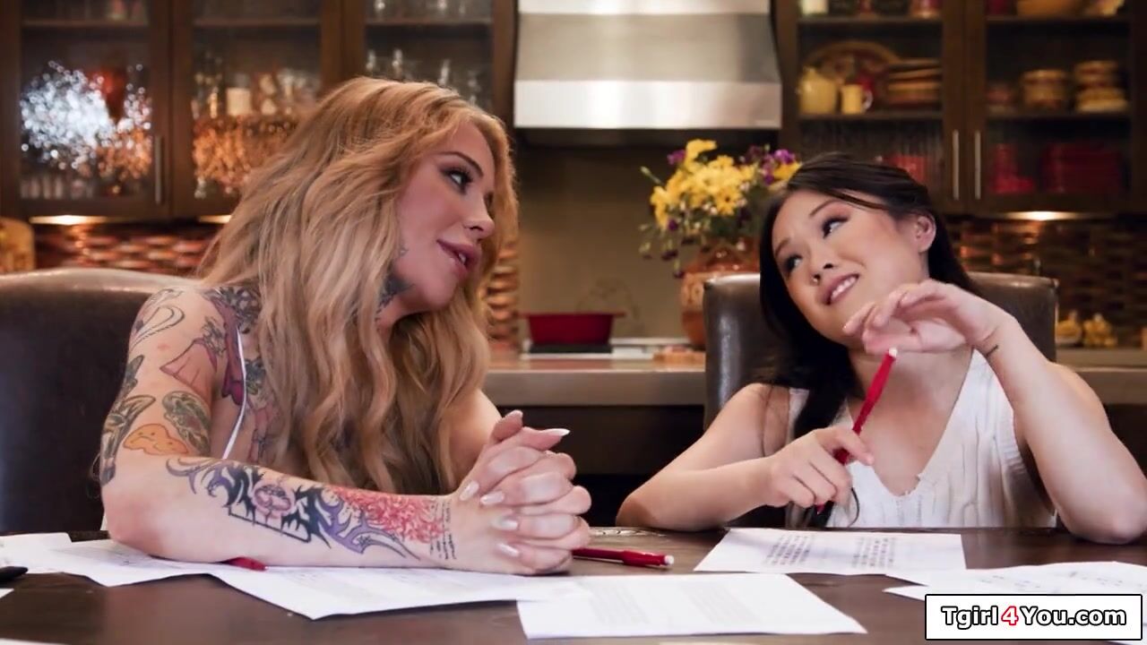 Busty trans teacher Gracie Jane flirts with asian assistant and they kiss.The tattooed shemale deepthroat facefucks her and the blonde tranny licks the brunette hairy pussy as the ts plays with her small tits.The big tits tgirl fucks the petite girl