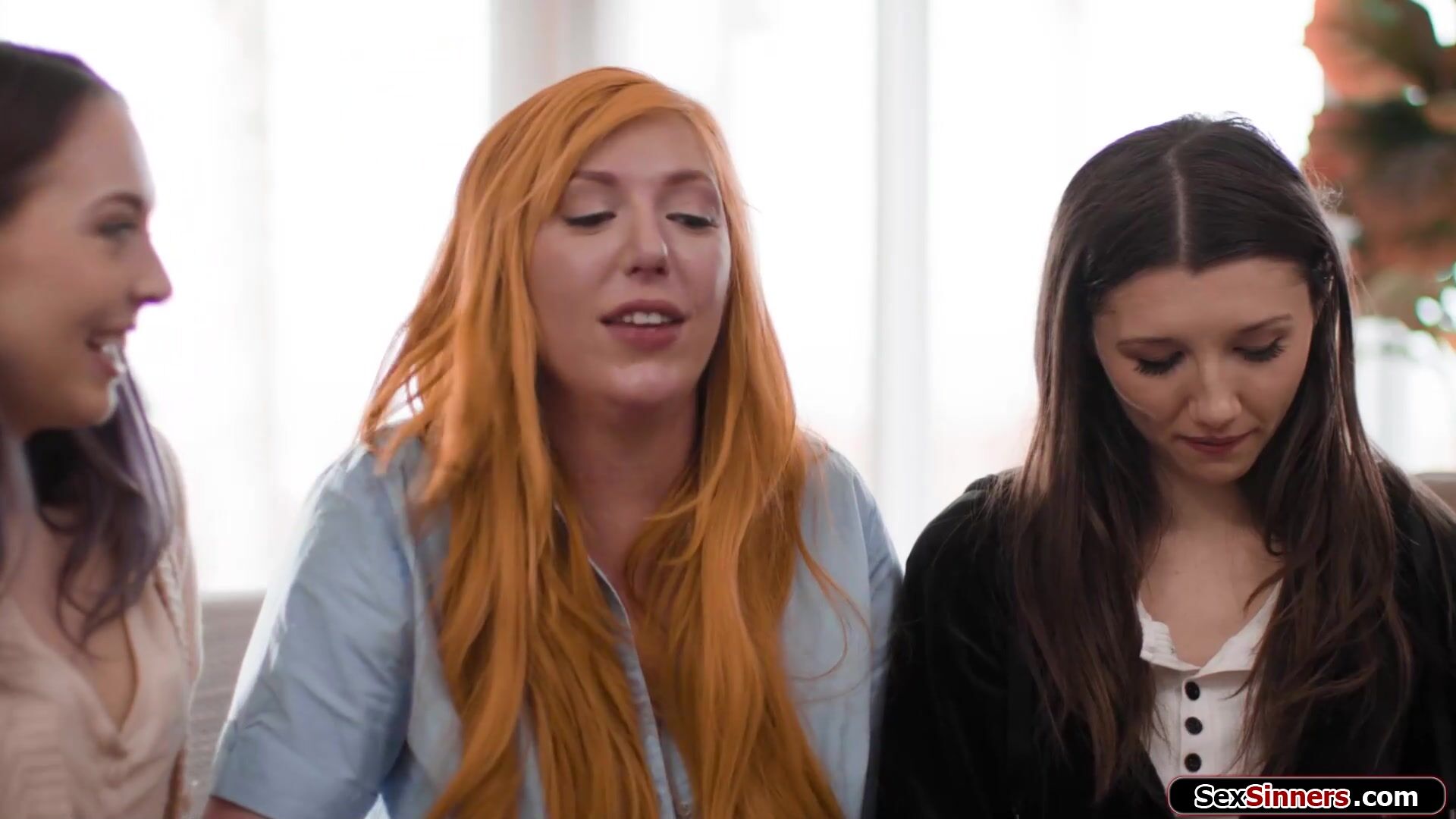 Nervous teen is glad her big tits milf neighbor will help her with her first lesbian date.Under the blanket the busty ginger cougar fingers both coeds pussy.All wet the petite small boobs brunettes get their first oral and they are ready to lick