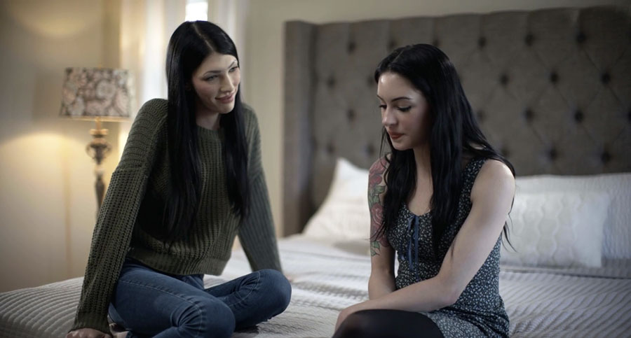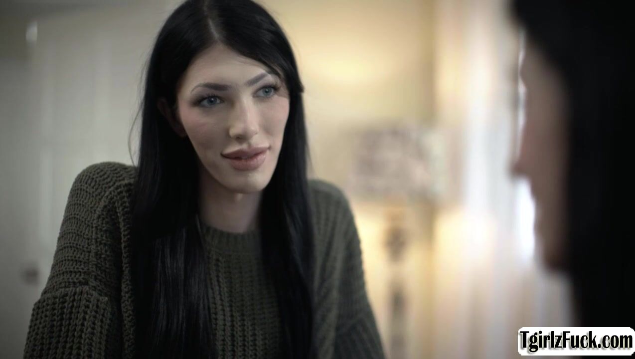 Tattoed female babe Anna de Ville confides in her shemale stepmom that she is going on a date with a woman. She is nervous and needs some advice. She asks to practice kissing her, before the two share a passion kiss they admit to having attraction for one another.