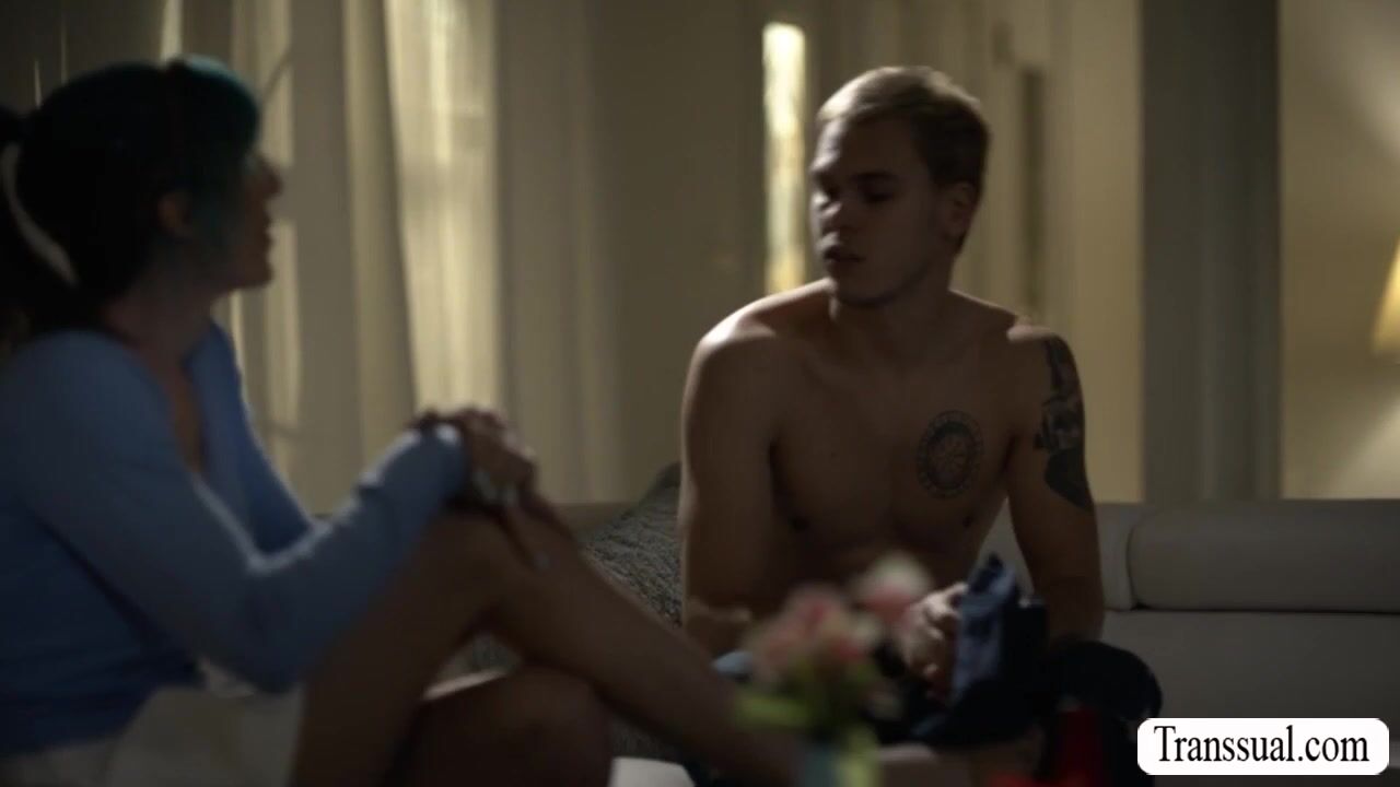 Busty brunette TS Melanie Brooks and her stepson are kissing each other on the bed.After that,she throats hard big dick passionately and in return,her stepson bareback fucks her wet asshole so deep and hard.