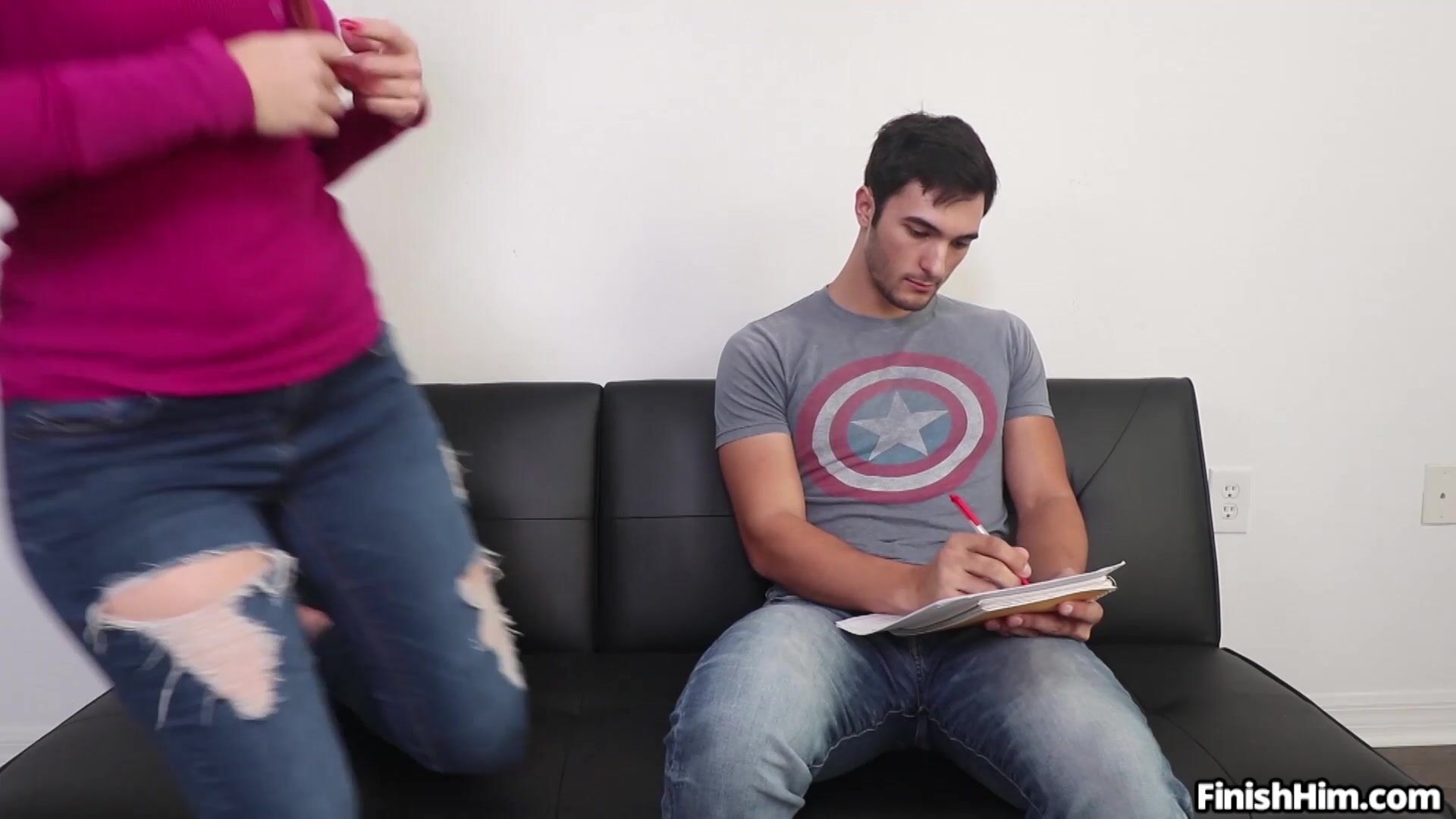 Kitty Quinn gives a handjob quickie to her man for a quick study break. She jerks him off and he cums all over himself.