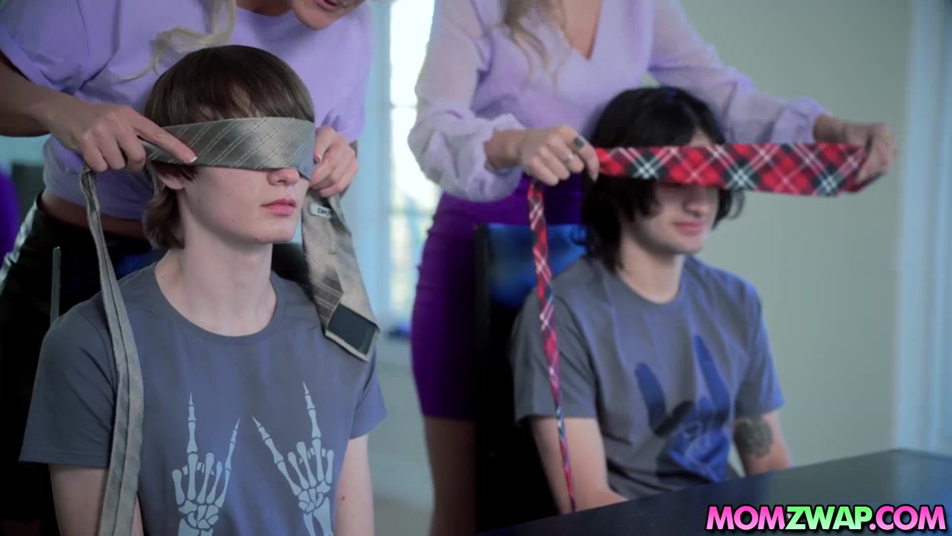 Kenzie Love and Alexis Malone want to get impregnated and the best way to do it is to get fucked by Elias and Spikey who are off to college. The horny milfs make a plan by blindfolding them and offering their pussies.