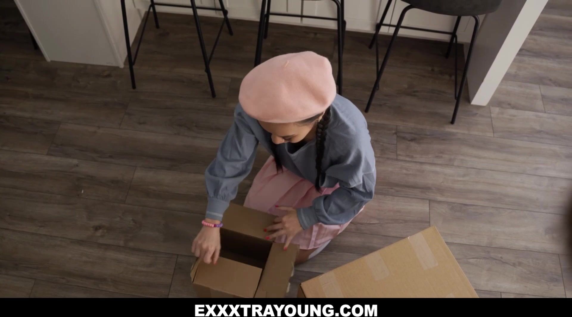 Kimmy Kimm struggles to bring huge boxes into her house when huge neighbor Chris offers help, but a massive dildo falls out of the box and Kimmy offers to show him how it can fit into her little pussy as a thank you for helping her.