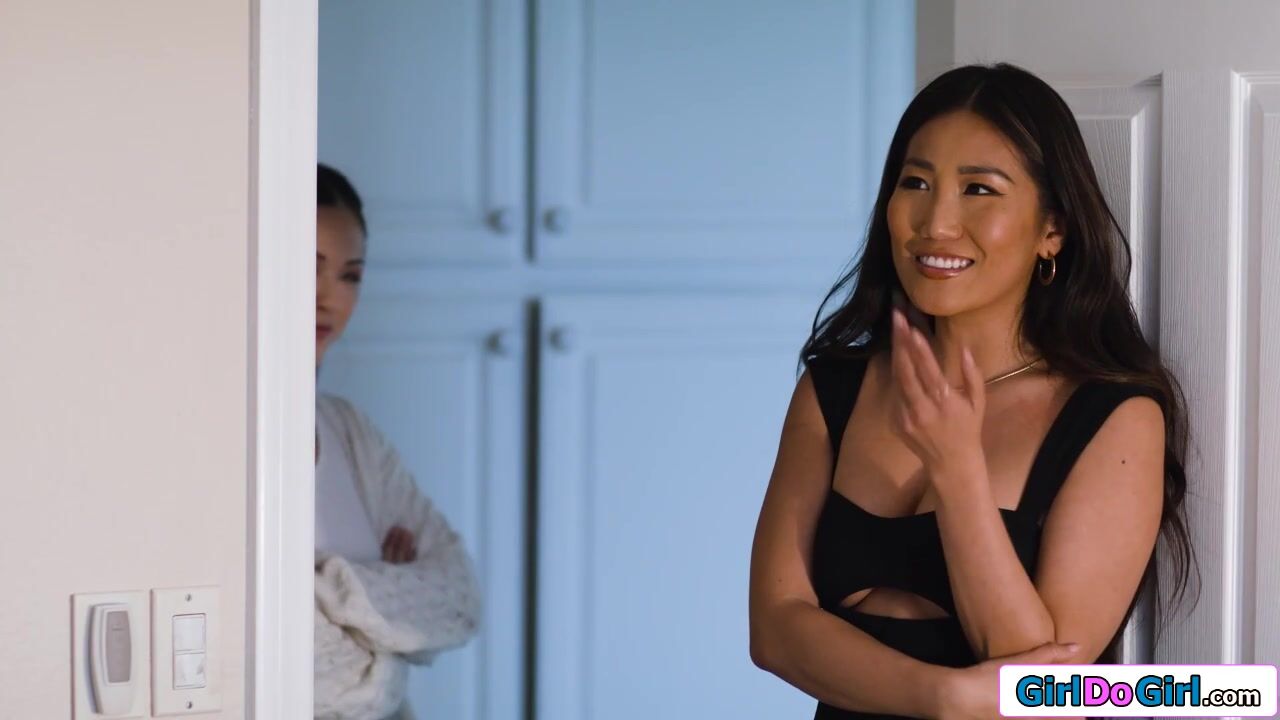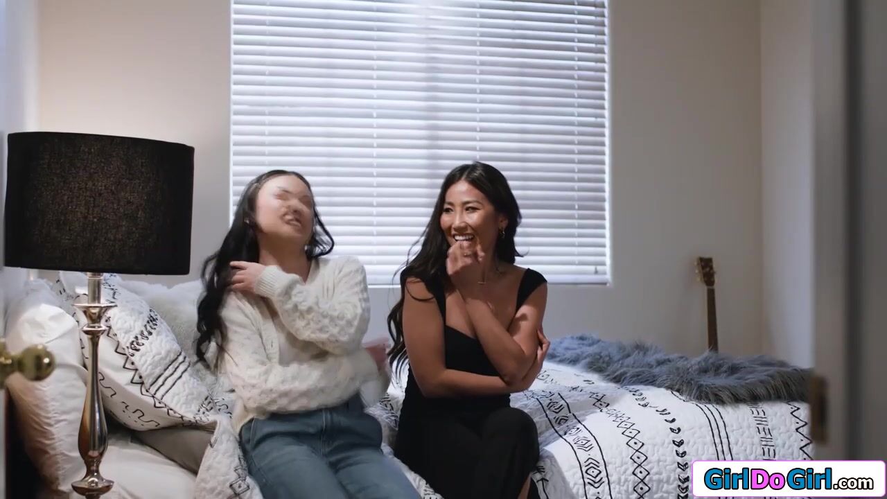 This hot asian chick knocked at my door and asked if she could take a look at her old bedroom.I made my move and kissed the petite brunette hottie.I sucked her tits and licked her wet snatch.She put my panties aside to eat out my hairy pussy