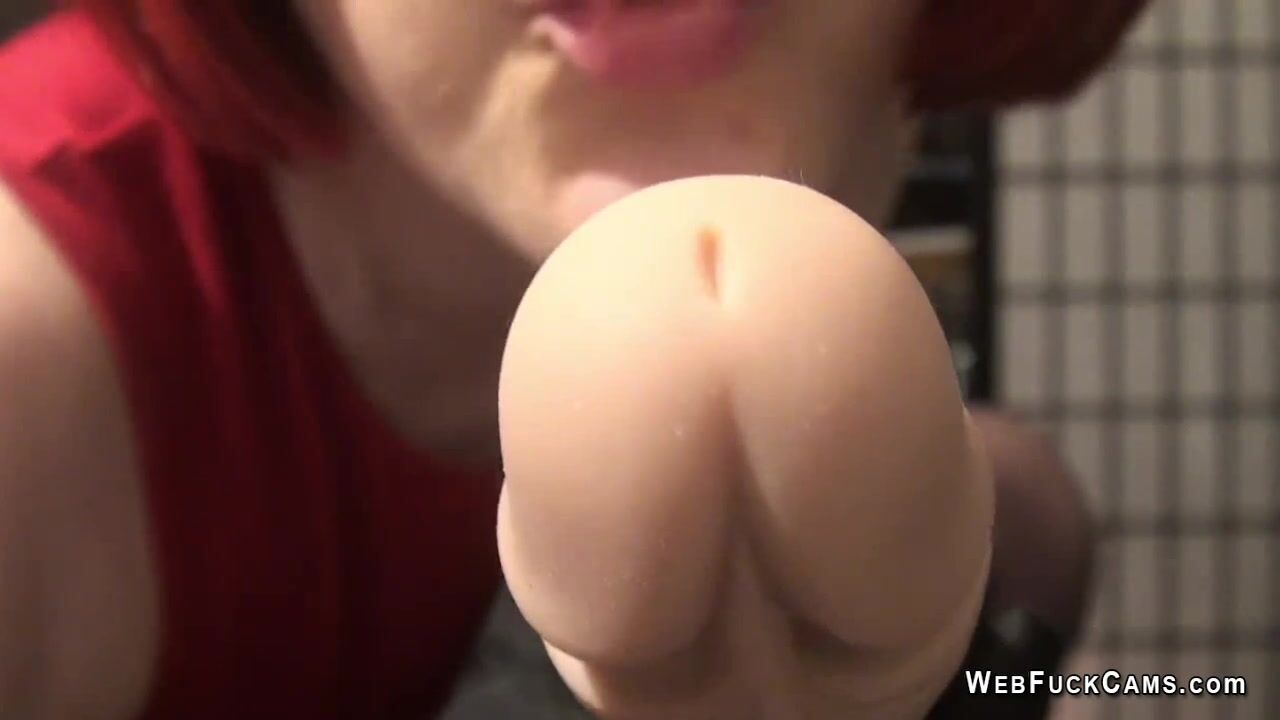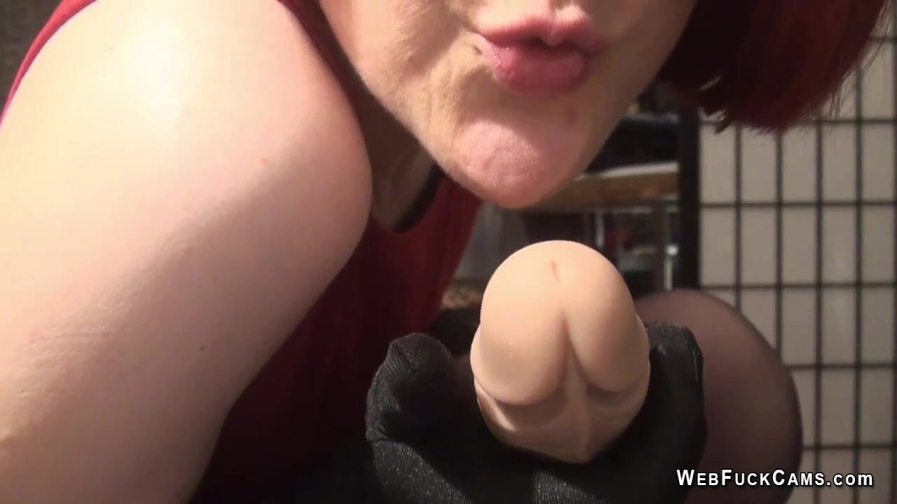 Redhead amateur Milf Mistress Vivian in tight red mini dress and black pantyhose wanking huge didlo and holding it between legs in live webcam show homemade solo