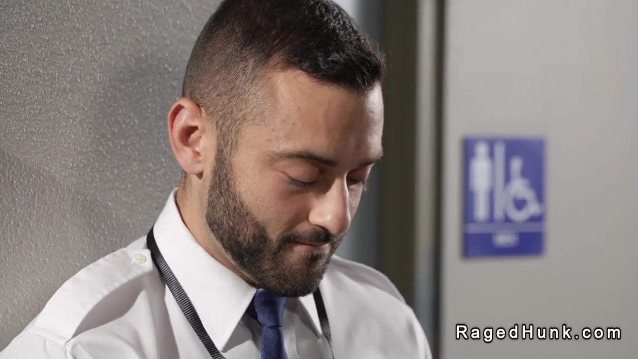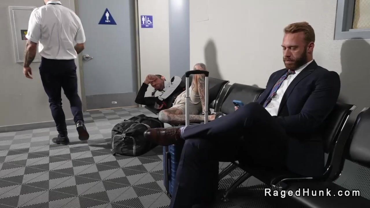 Flight attendant Drew Valentino on hook up app finds businessman Brogan in same waiting room and he takes him in public rest room for anal sex before their flight