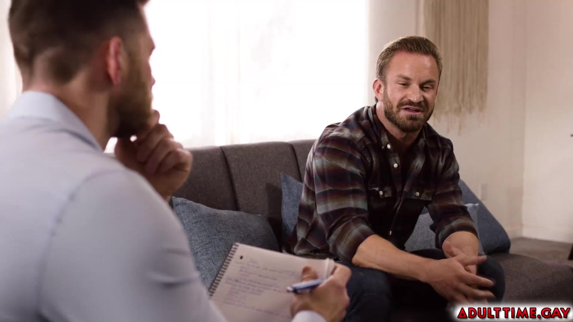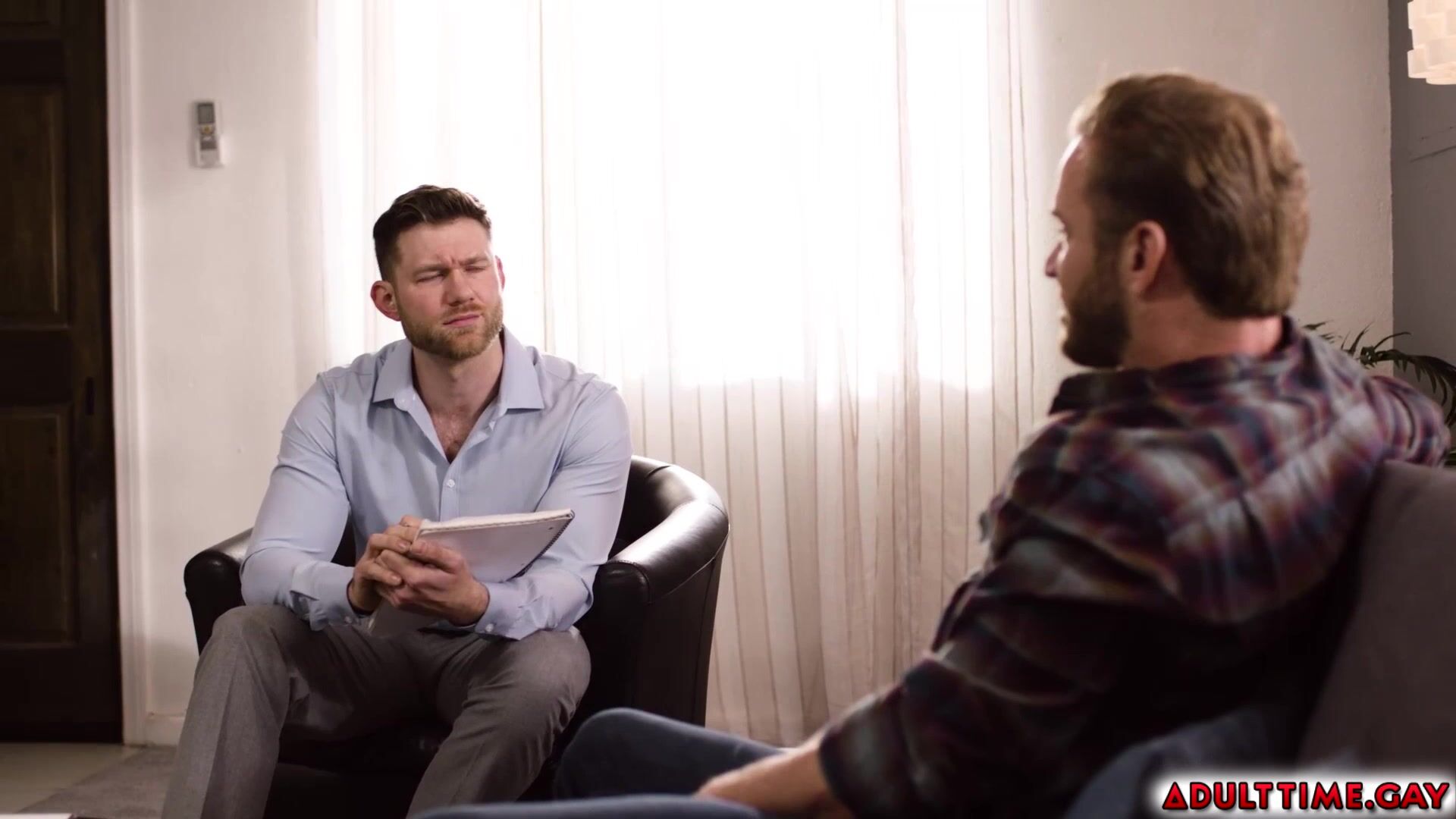 Bruce Jones visits marriage counselor Caden Jackson and wants to try anal with his wife but he is scared that she will not understand, so Caden offers his ass for his first-time experience and helps him throughout the process.