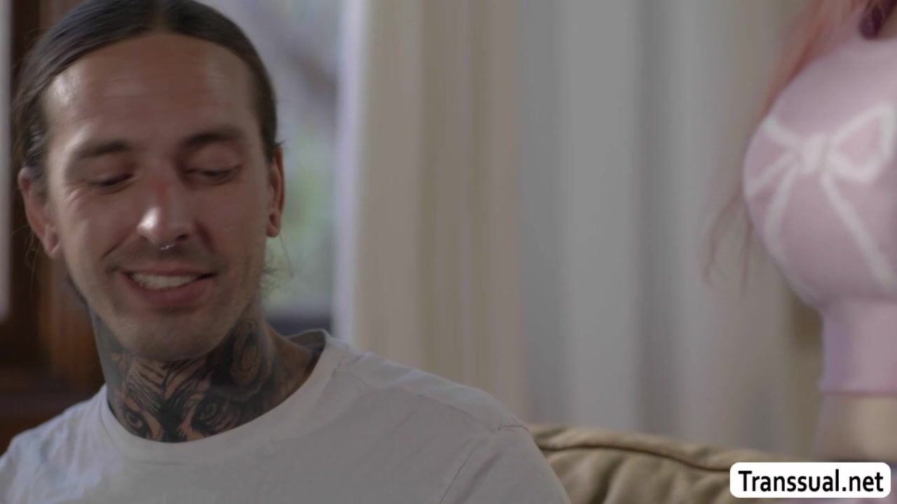 Aroused stepbro Ruckus deepthroat blowjobs his pale redhead shemale Mimi Oh,then the colored hair tranny sucks his cock.The busty trans rides his big cock bareback anal.The tattooed dude fucks her more in several positions.