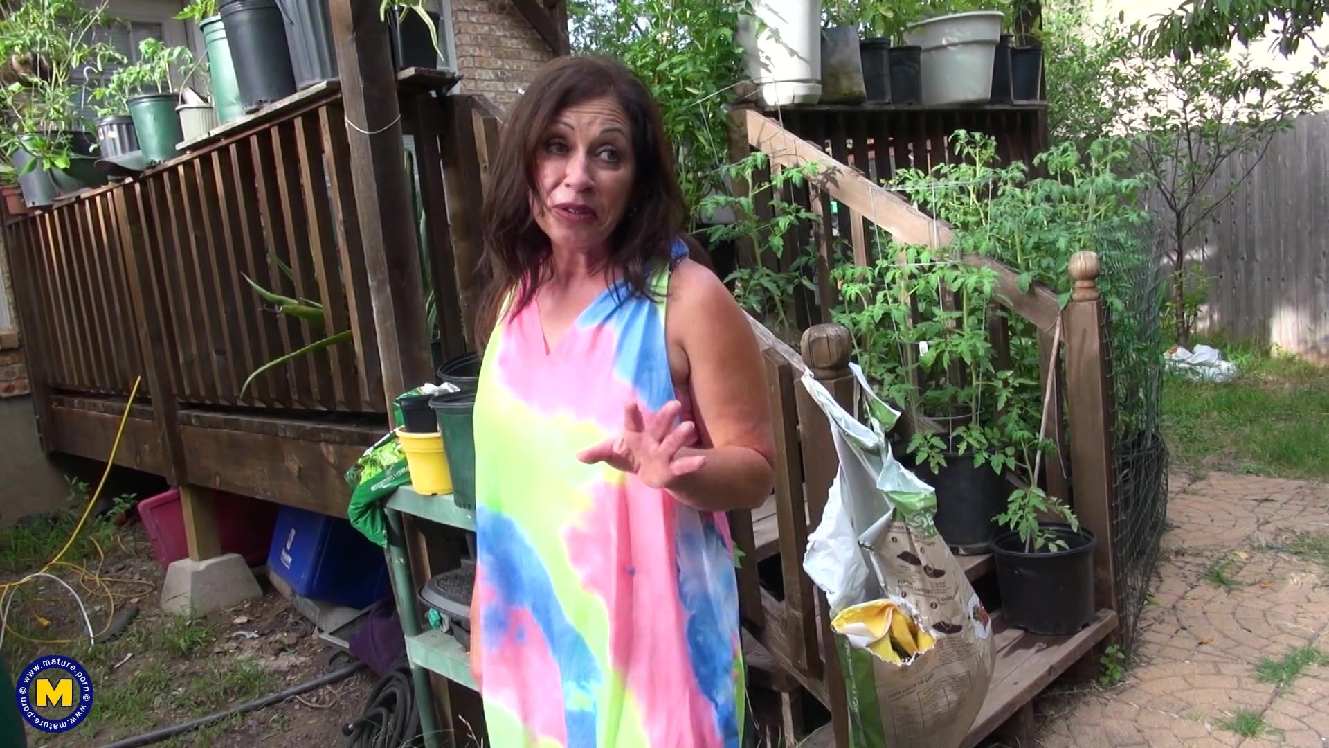 2020-Mature Samy Rodriguez is getting wet in her garden