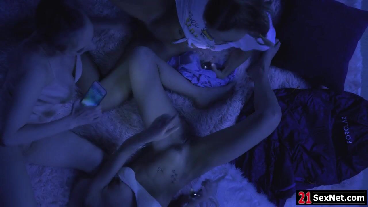 Blonde teen and her friends cuddle together when the lights went out.Her bffs start touching and masturbating her clit.The get turned on and do a three way pussy licking.After the electricity went back,she gets her dildo and fucks their ass and pussy