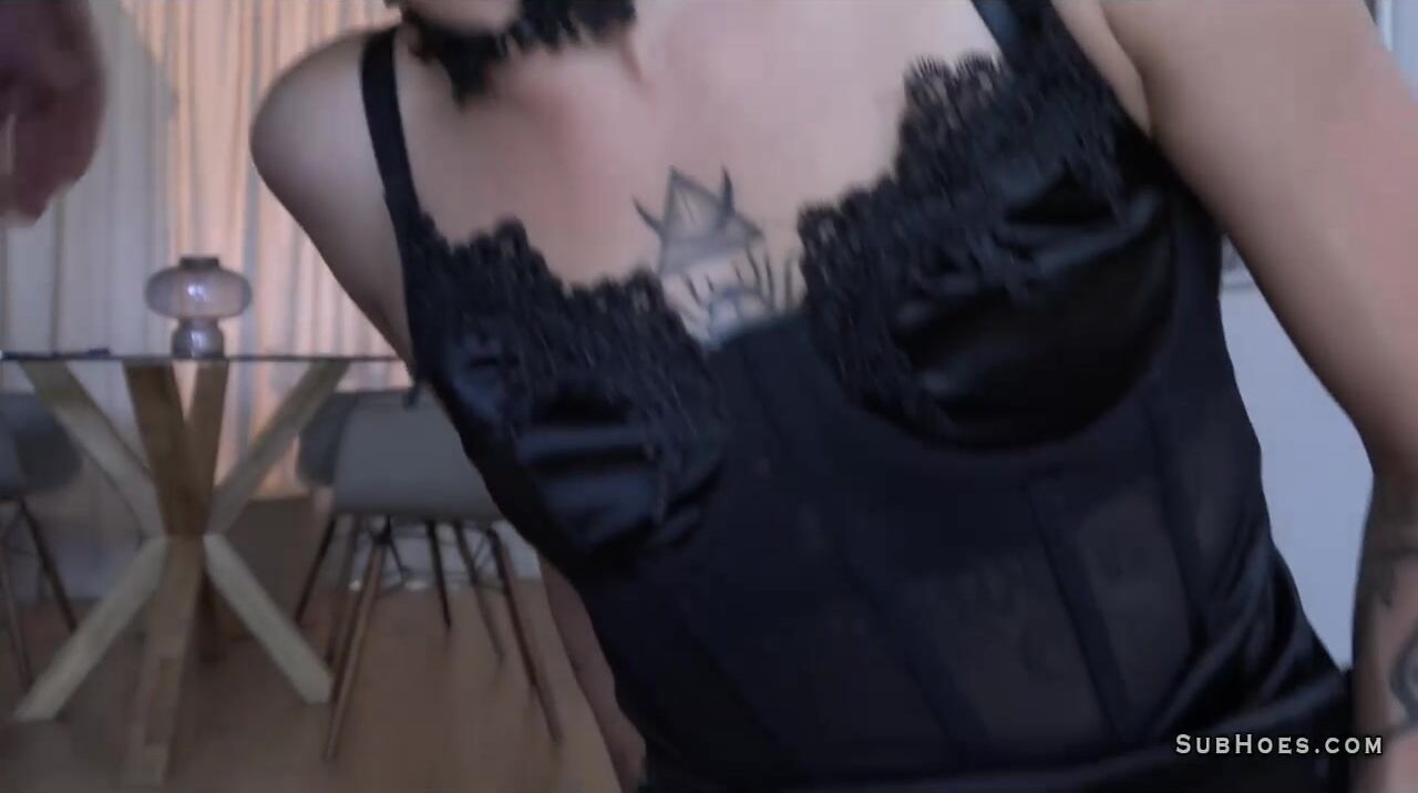 British dirty and hairy sub slut in black lingerie and stocking Pussy Kat shows hard and rough mouth fucking and double penetration with domination in threesome