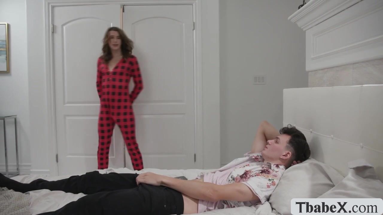 Ladyboy Jayne Calloway invites the stepbro of her friend into her room and they start kissing each other on the bed.After that,she throats his hard big cock passionately and in return,the guy licks her ass first before he bareback fucks it.