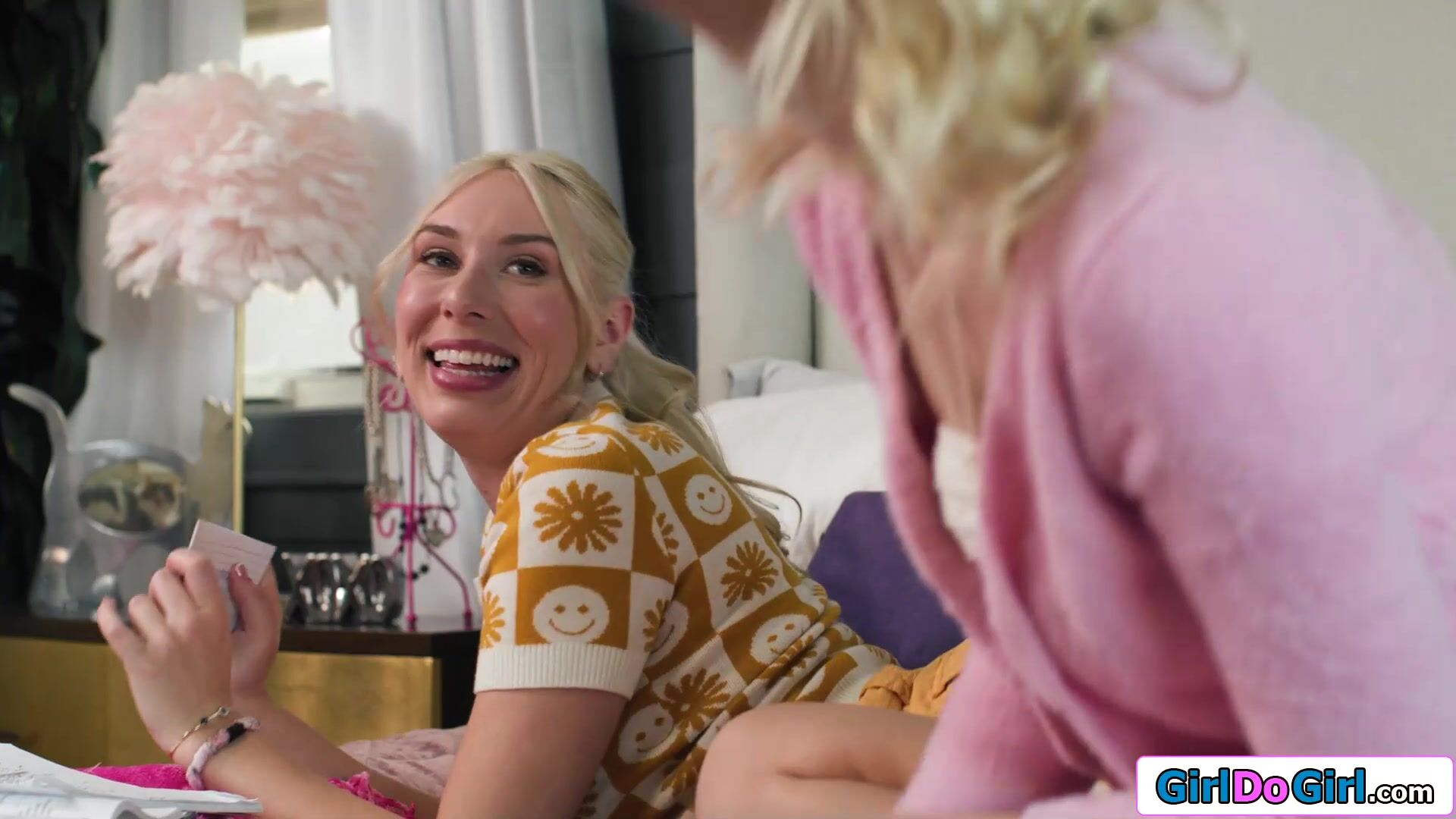Big tits blonde coed Kenna James loses a bet to her busty study buddy with benefits Kay Lovely and is dominated as a result.The babe is kissed and she gets her snatch fucked by a strapon.After that she has to lick her gfs pussy until she orgasms