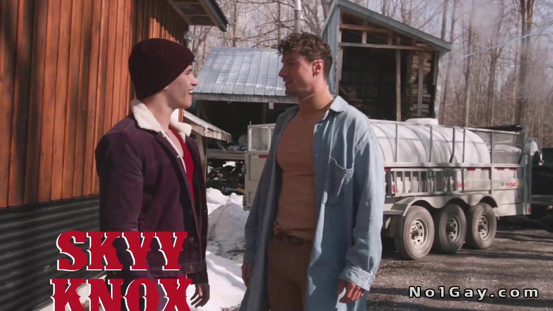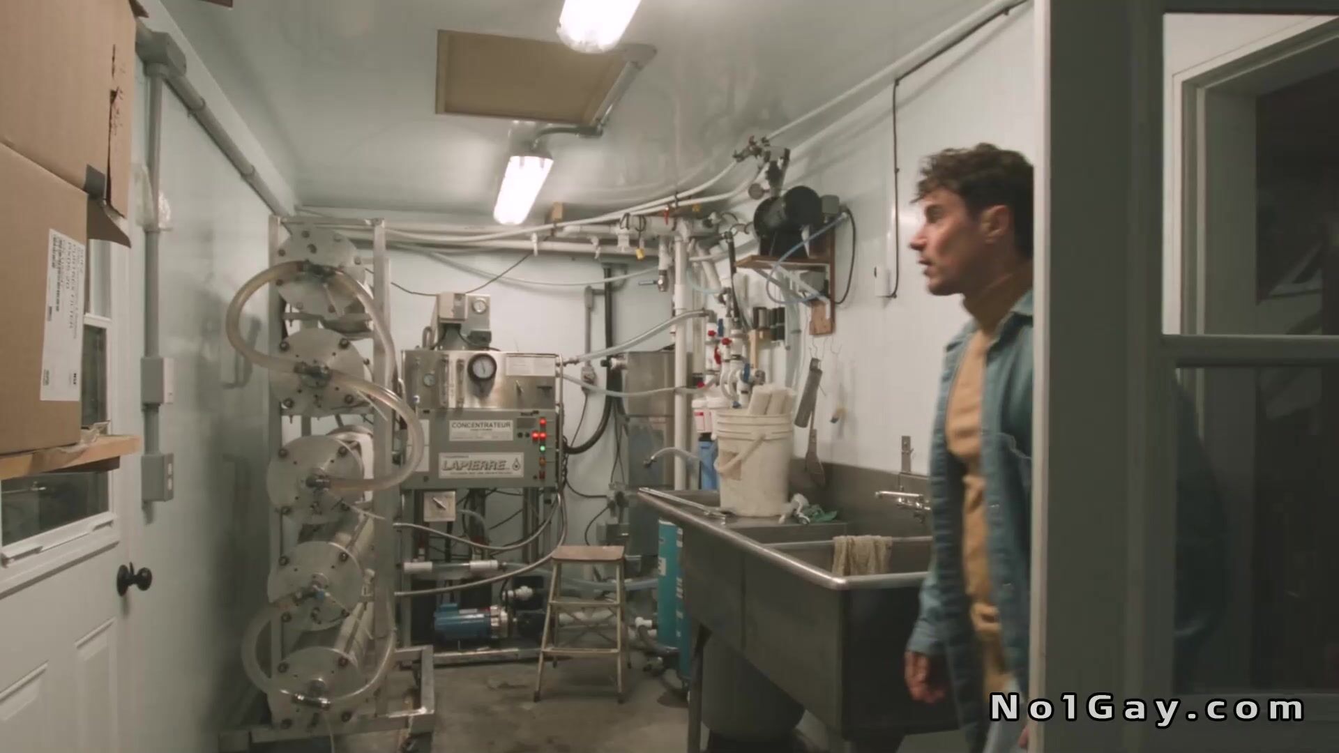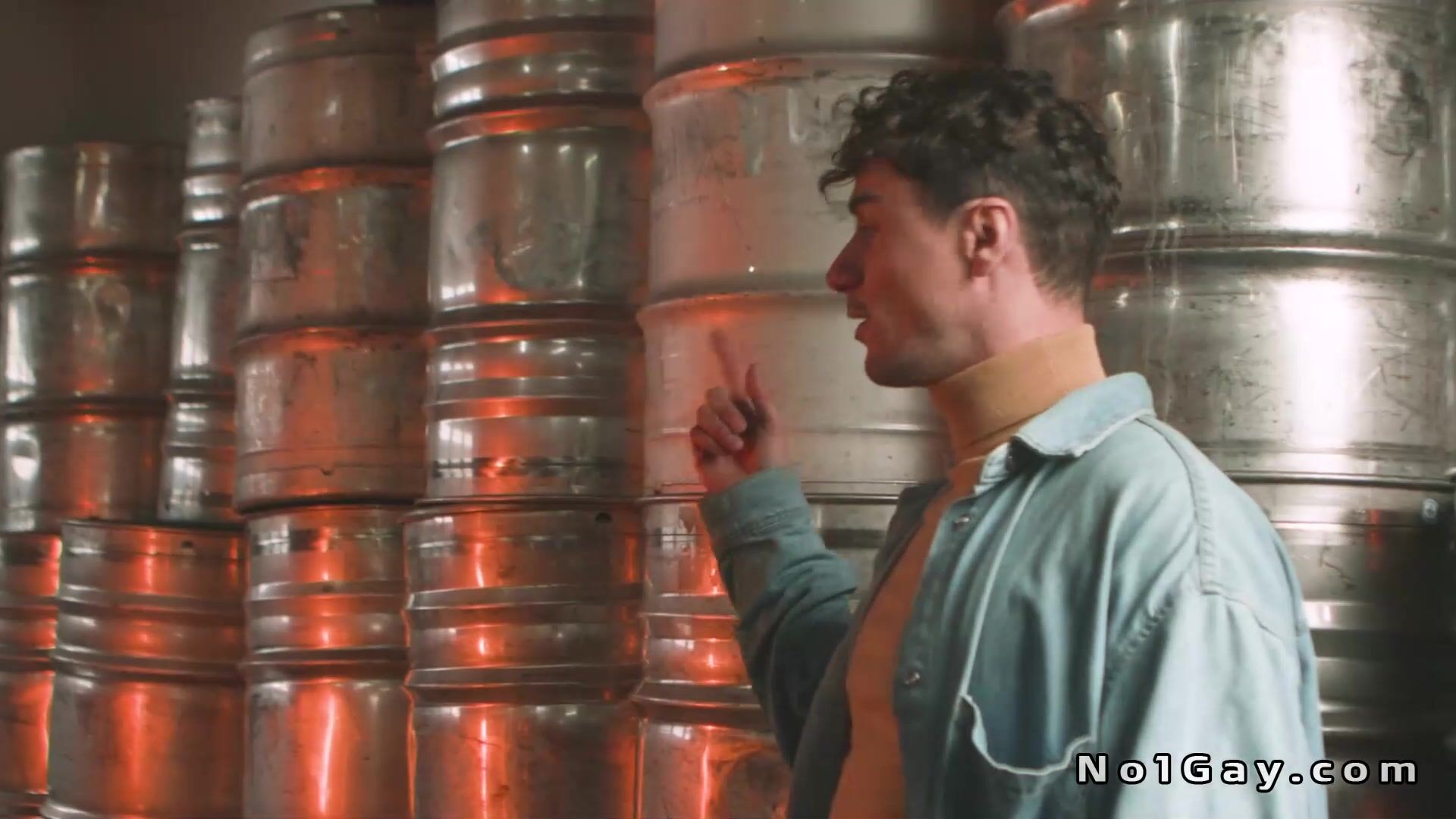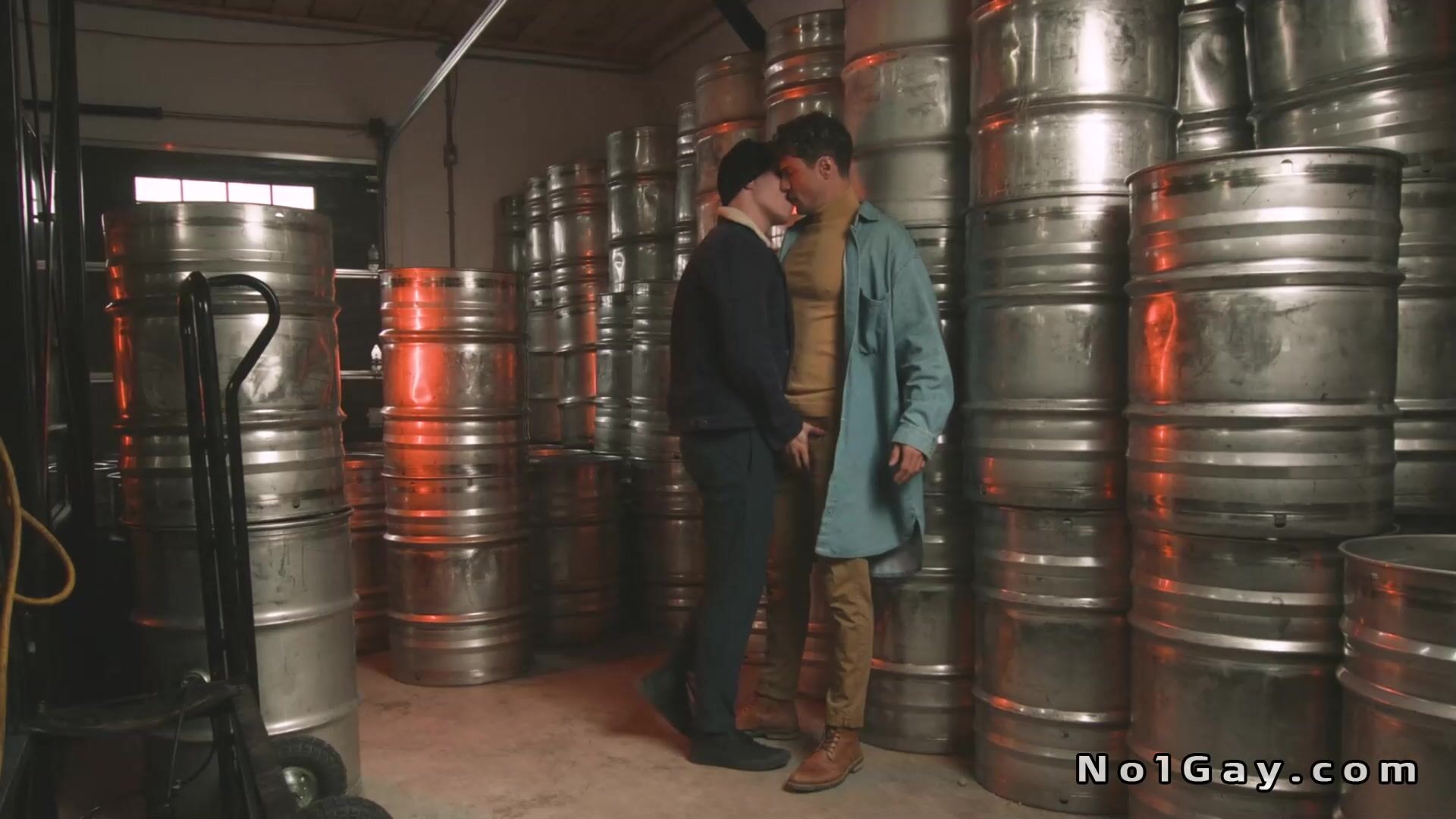 Sugar maker Skyy Knox has been tasked with teaching newbie Maverick Sun and soon they are fully naked and anal fucking against a wall of metal barrels in the back room