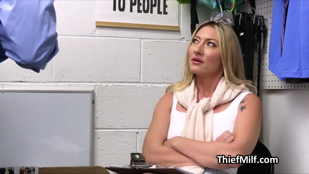 This mall cop got a fat one and he is not afraid to use it. His next client this lovely blonde milf got busted with a fake card. Time to fuck her!
