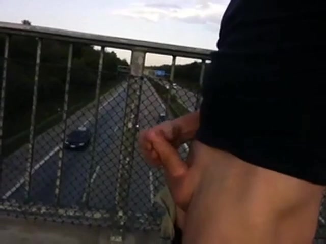 auf der Autobahnbrücke den steifen Schwanz gewichst sodass alle sehen konnten wie das Sperma in hohem Bogen gespritzt ist.