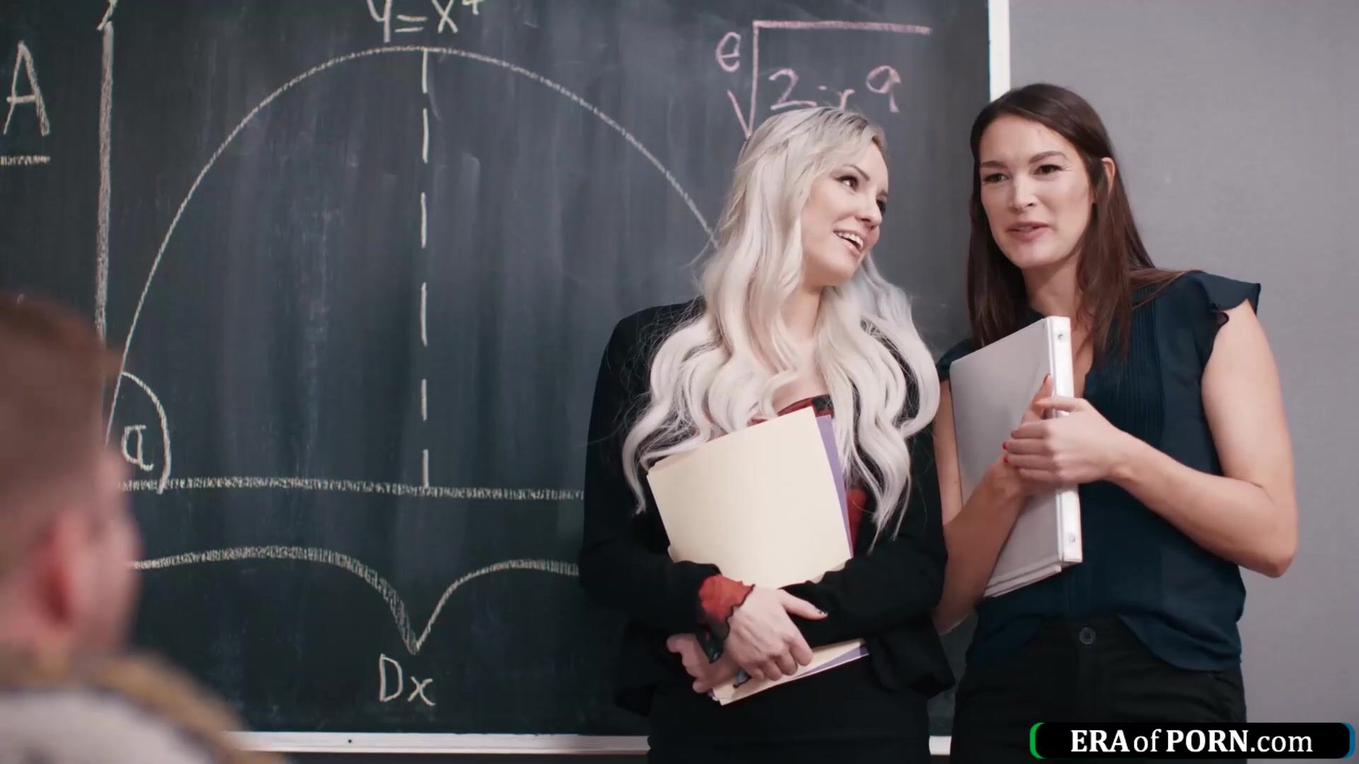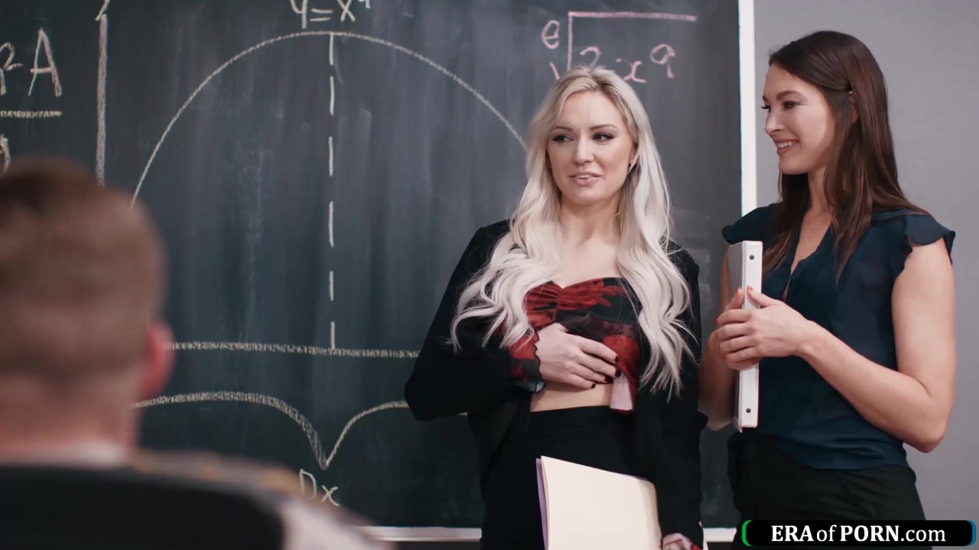 Milf teachers Kenzie Taylor and Katrina Colt catch a colleague jerking off in the classroom.The busty blonde shows him her big tits before they suck.He tittyfucks the cougar and bangs the small boobs brunette while she licks the babes hairy pussy