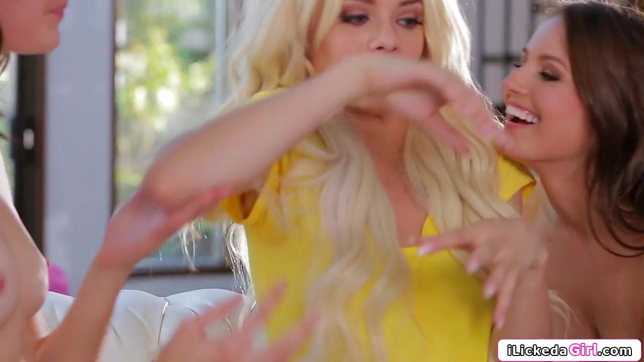 Scarlett Sage and Lena Anderson try seducing their straight blonde best friend Elsa Jean to join them masturbating.They strip her naked and kiss her nipples.Elsa gives in,she lies down while Scarlett is facesitting and Lena licking her shaved pussy.