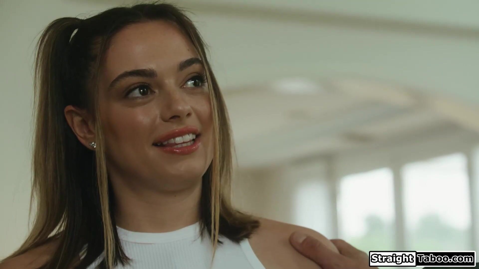 Sophia Burns is cheating on her bf with his coach but got pregnant.He has a plan to cover up his role.He gets them to have sex ifo him and the small tits babe is licked and sucks his big black cock.The guy fucks her shaved pussy and creampies his gf
