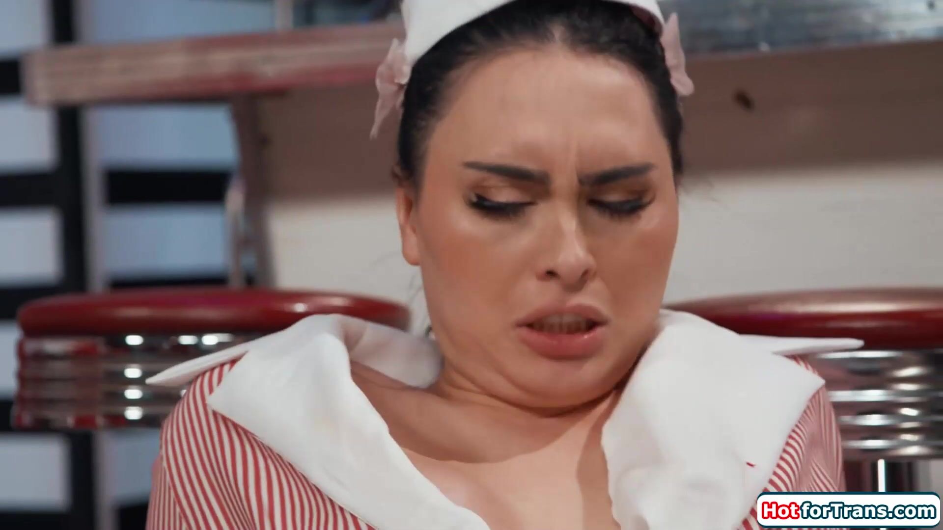 Big tits asian tgirl waitress Ember Fiera is over the moon when her military husband walks into her diner.The tgirl is kisses and gets her boobs sucked.The busty brunette tranny gets a blowjob and sucks his big cock.The trans bareback anal rides him