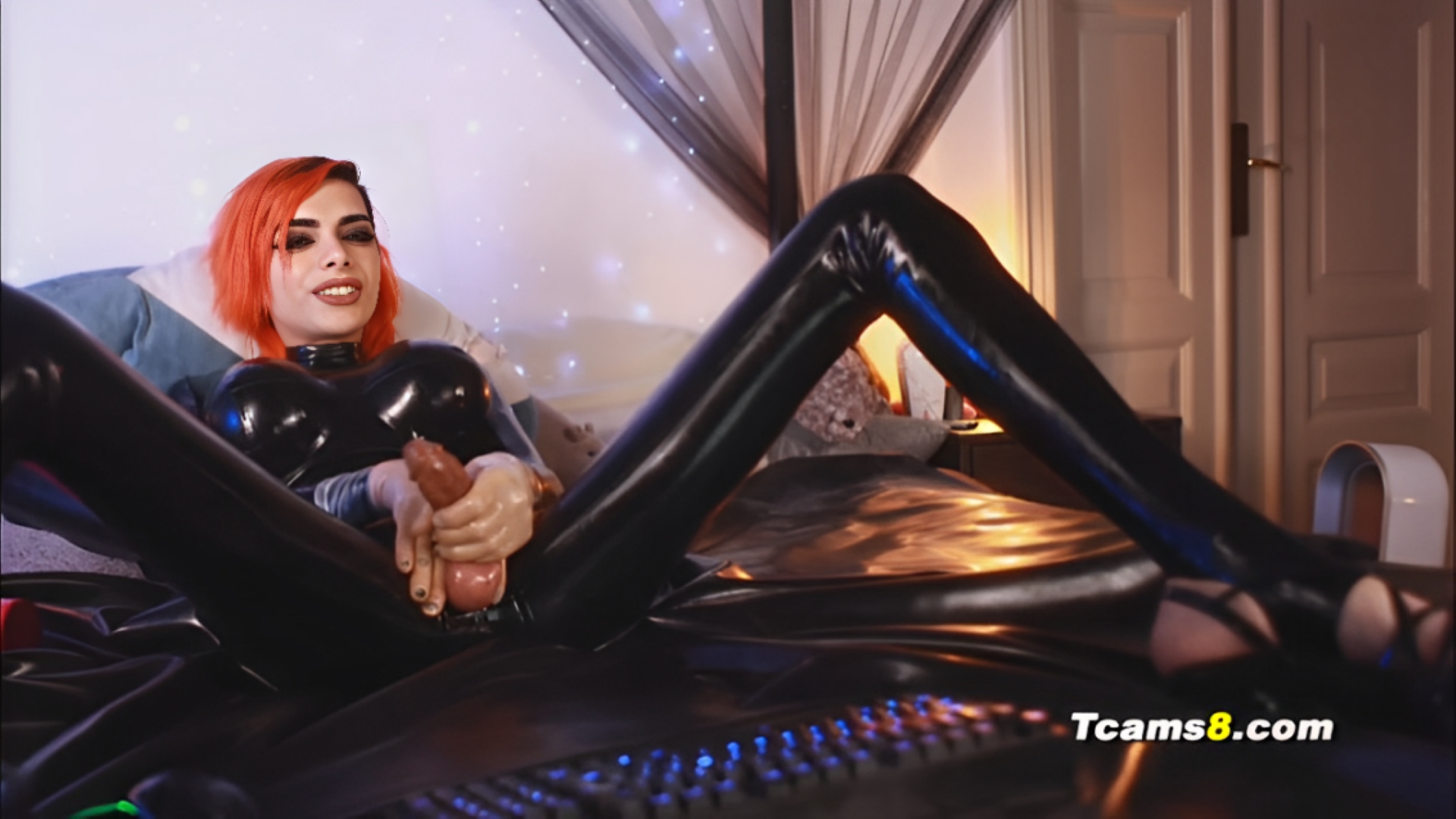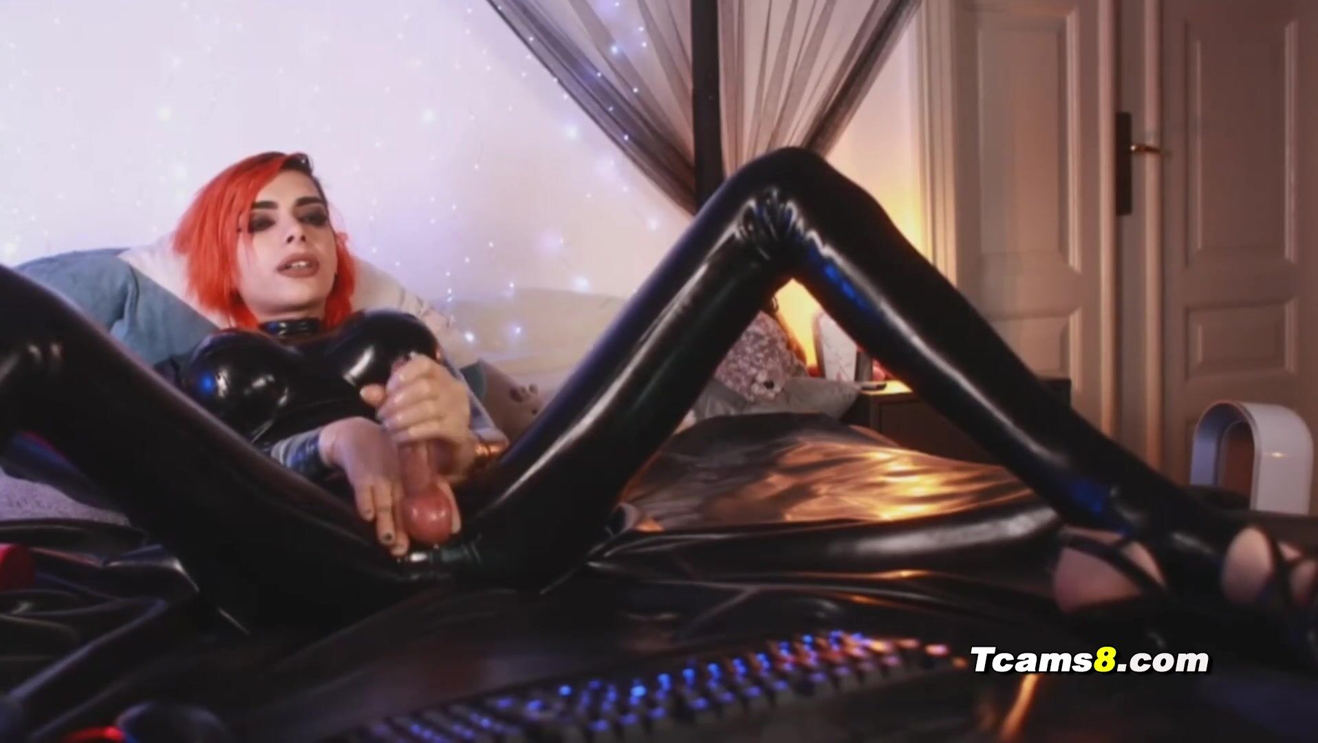Shemale on latex suit jerks off on cam