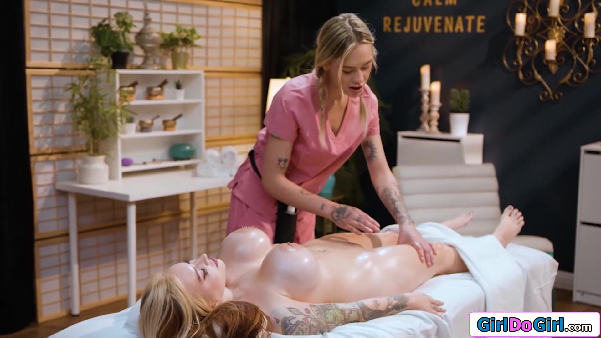 Huge boobs petite Cubbi Thompson gets a relaxing full body massage from her small tits masseuse Dylan Moore and allows her to work on her ladyparts.The tattooed brunette gets all the tension fingered out and returns the favor by 69 pussy licking