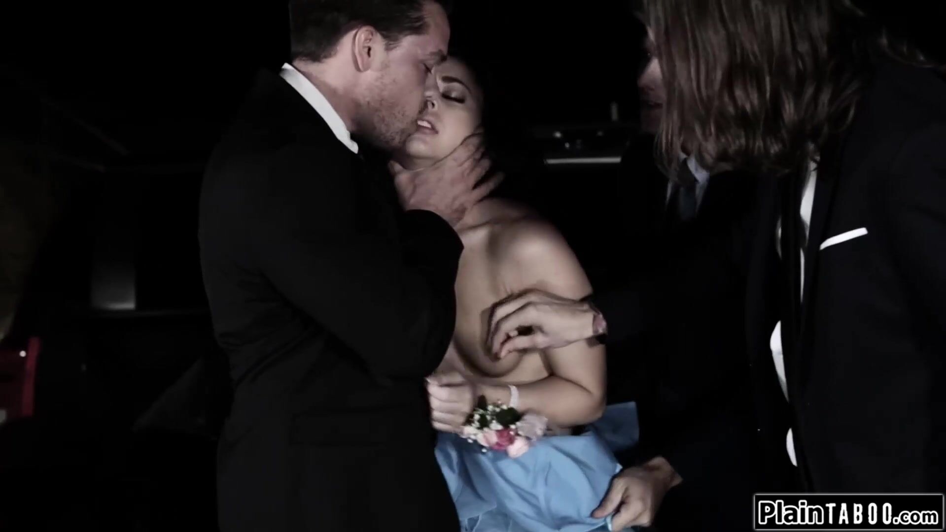 Teen wallflower Whitney Wright faces her dates best friends and caves under group pressure.The horny dudes rip off her dress and make her deepthroat their cocks outdoors.The small tits petite brunette has to fuck all their big throbbing dicks