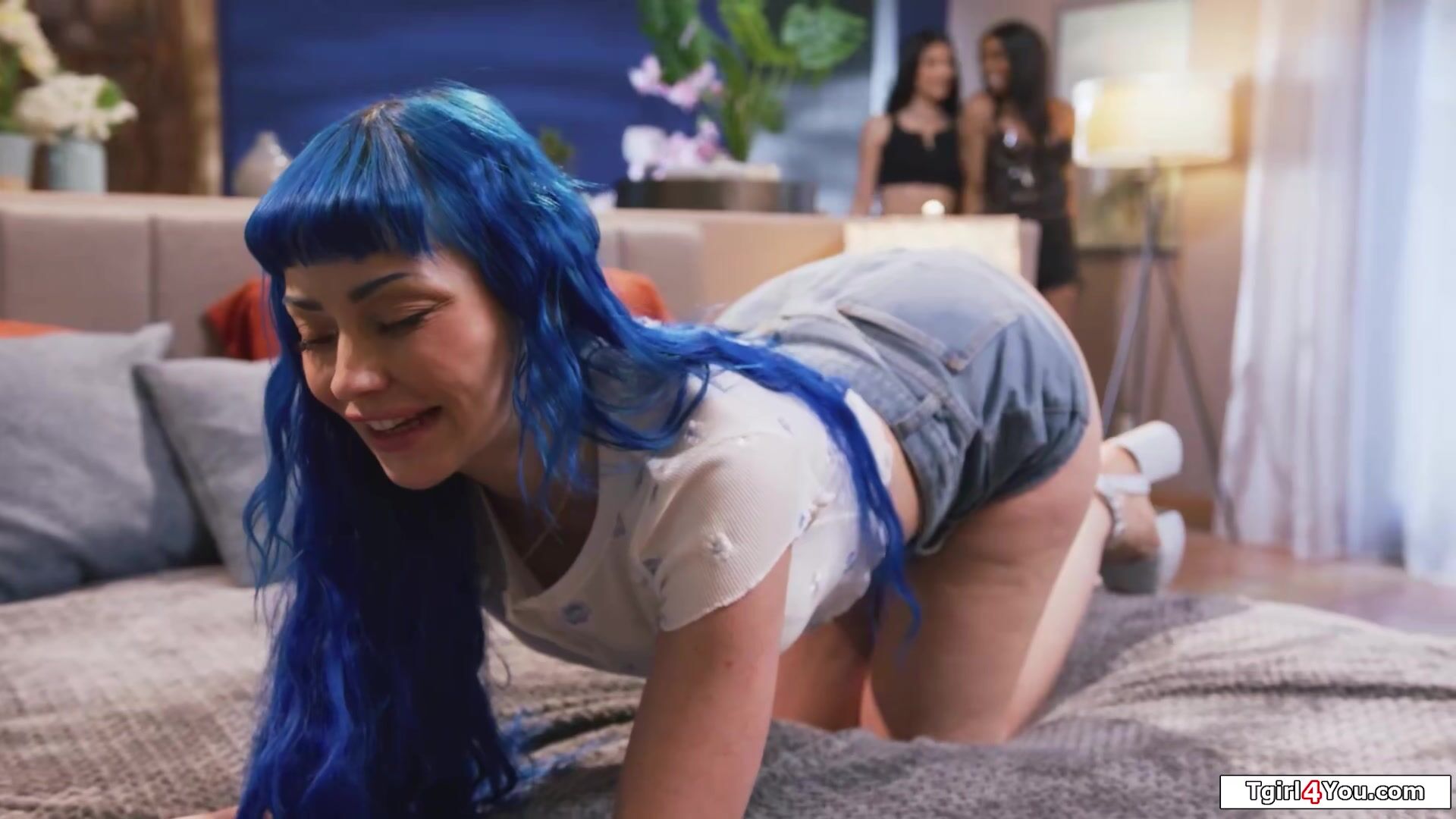 Latina shemale Zariah Aura and busty black tranny Leilani Li respond to their busty friend Jewelz Blu her sex add.The blue haired babe is ass fingered and facefucked while analed by the ebony tgirl.The transsexuals dp and double vagina fuck her