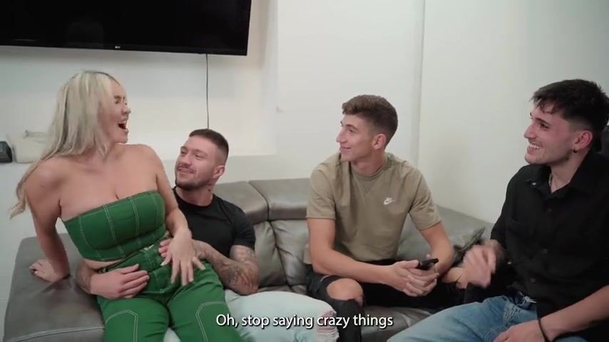 Shaved Blonde Whore Fucks Three Cocks