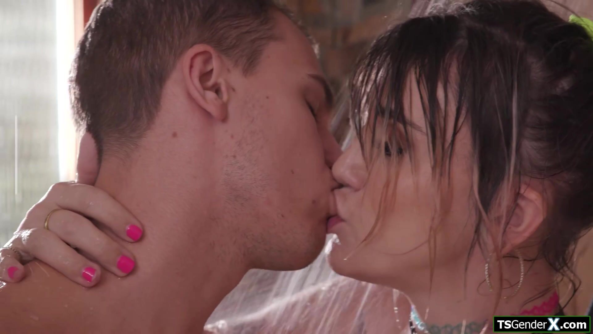 I fixed the shower and now I get to fuck my tgirl neighbors.Shemales Gracie Jane and Lena Moon are already naked and they handjob each other.The busty tattooed tranny is deepthroated by her trans girlfriend while she bareback anal rides the guys cock