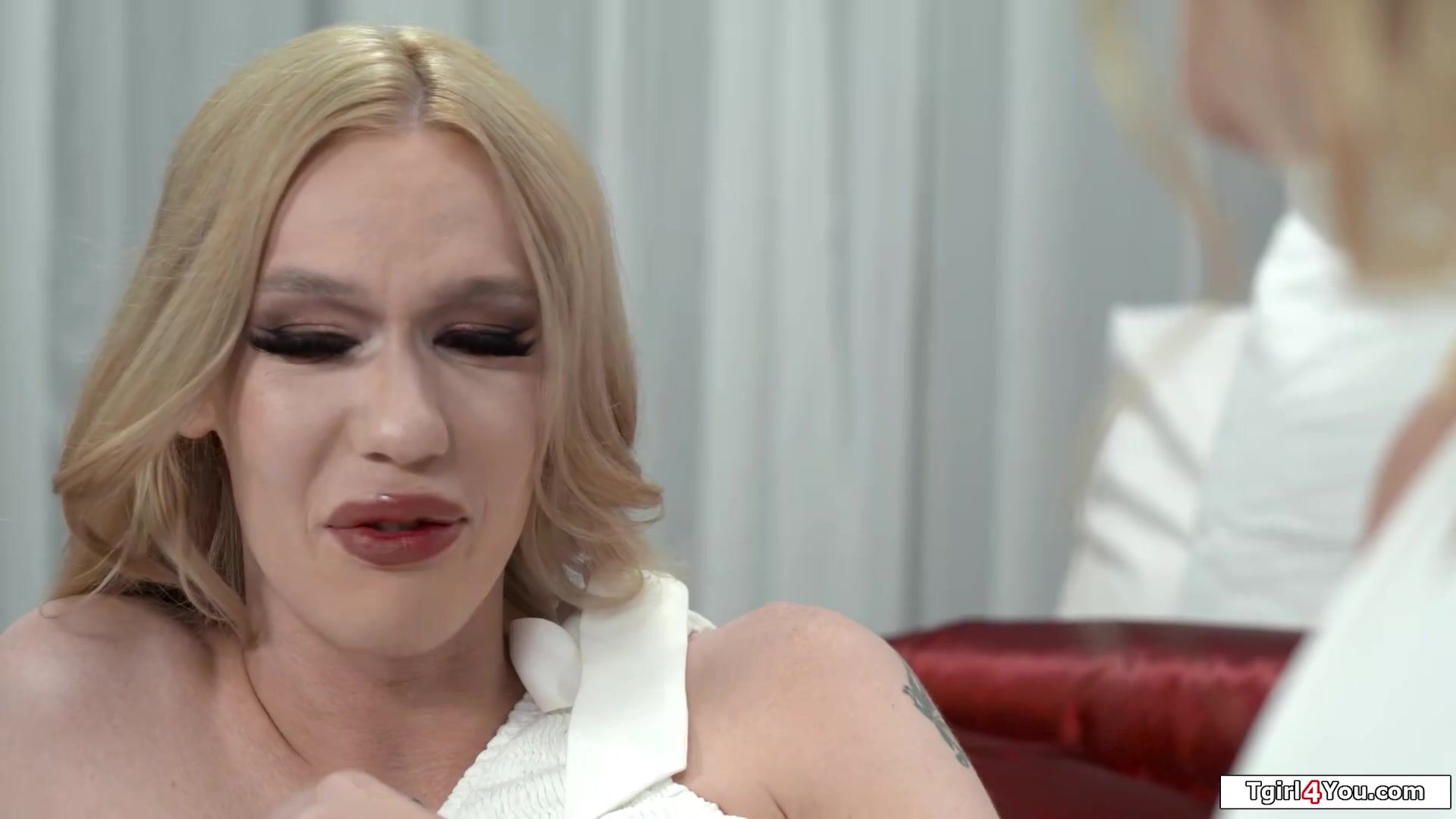Busty trans goddess Crystal Thayer is seduced by River Lynn.The big tits shemale is kissed and deepthroat facefucks her.The blonde tranny licks her shaved pussy and bangs her.On all fours River is doggystyled by the horny tgirls transsexual cock