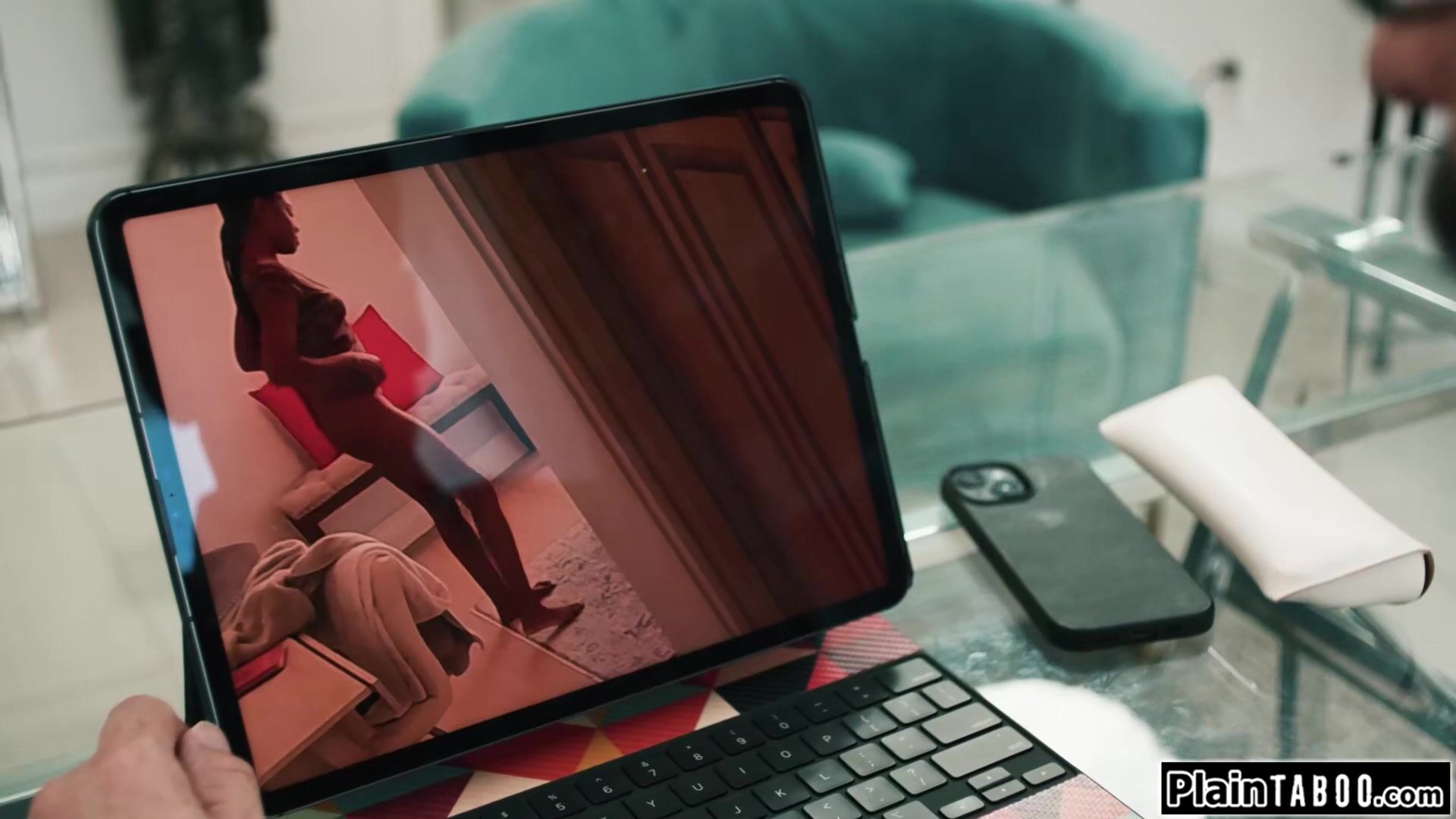 Stepdad caught a glimpse of his ebony stepdaughter Destiny Mira nude on the nannycam.She catches him with a camera in her room and makes him watch her.On his knees the black babe makes him eat her out.She deepthroats and squirts from fucking
