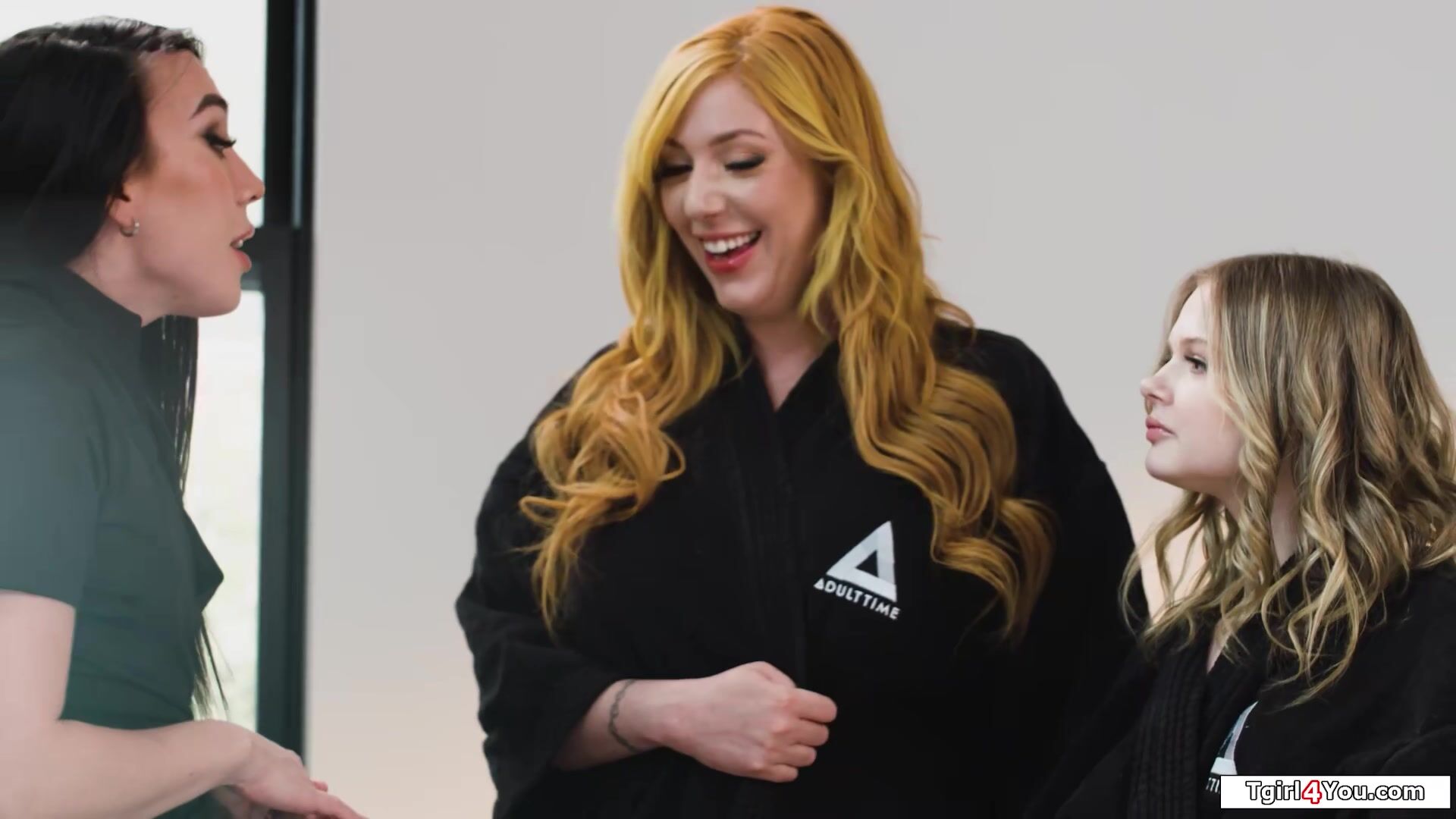 Tgirl Kasey Keis shemale cock hangs above busty Lauren Phillips face and she doesnt mind a suck.The trans facefucks while Coco Lovelock licks the milf.The small tits tranny footfucks the redhead cougars pussy and bangs her while Coco gets oral