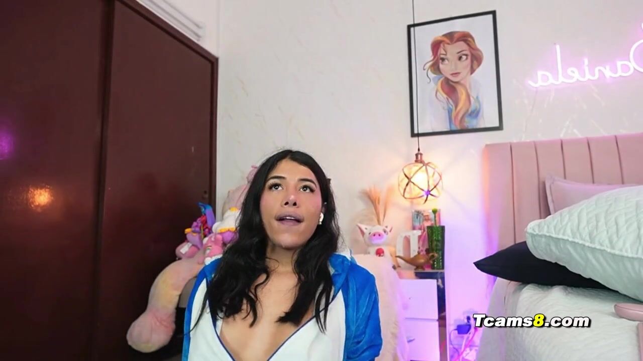 Gorgeous latina trans in pajamas suit jerks in sucks dildo