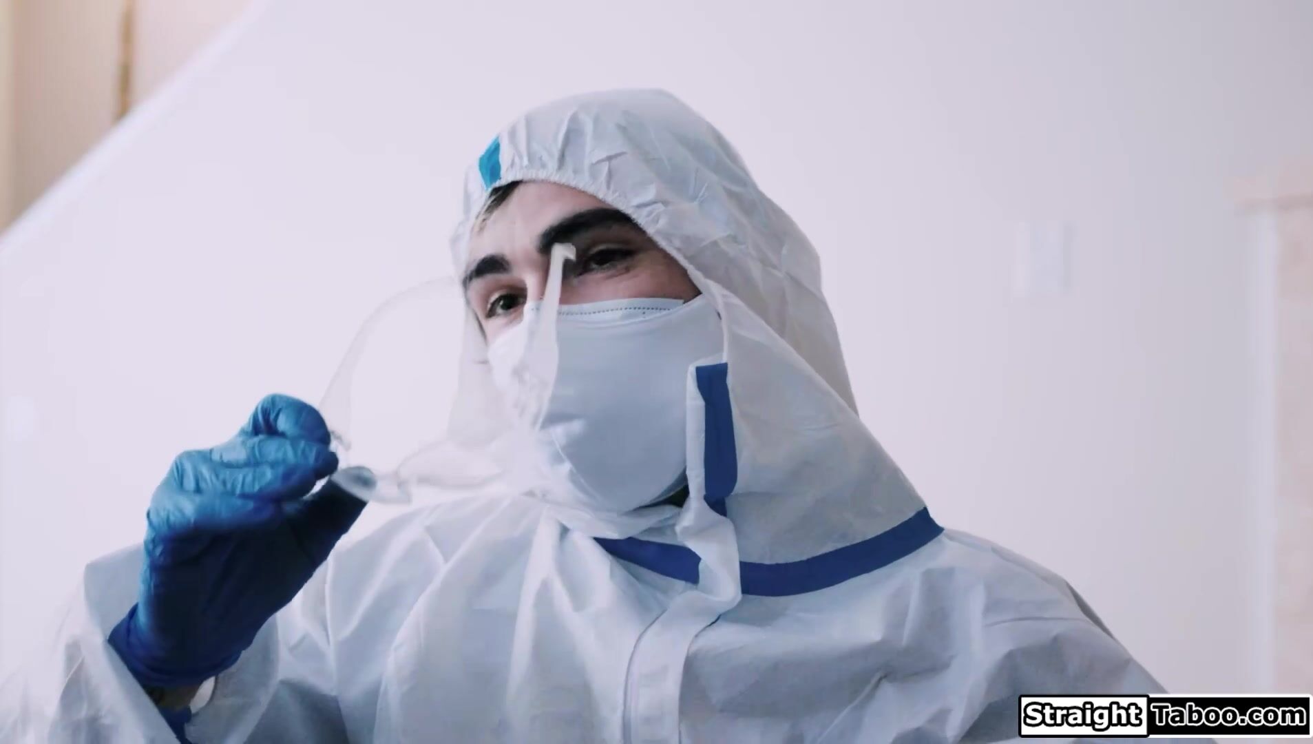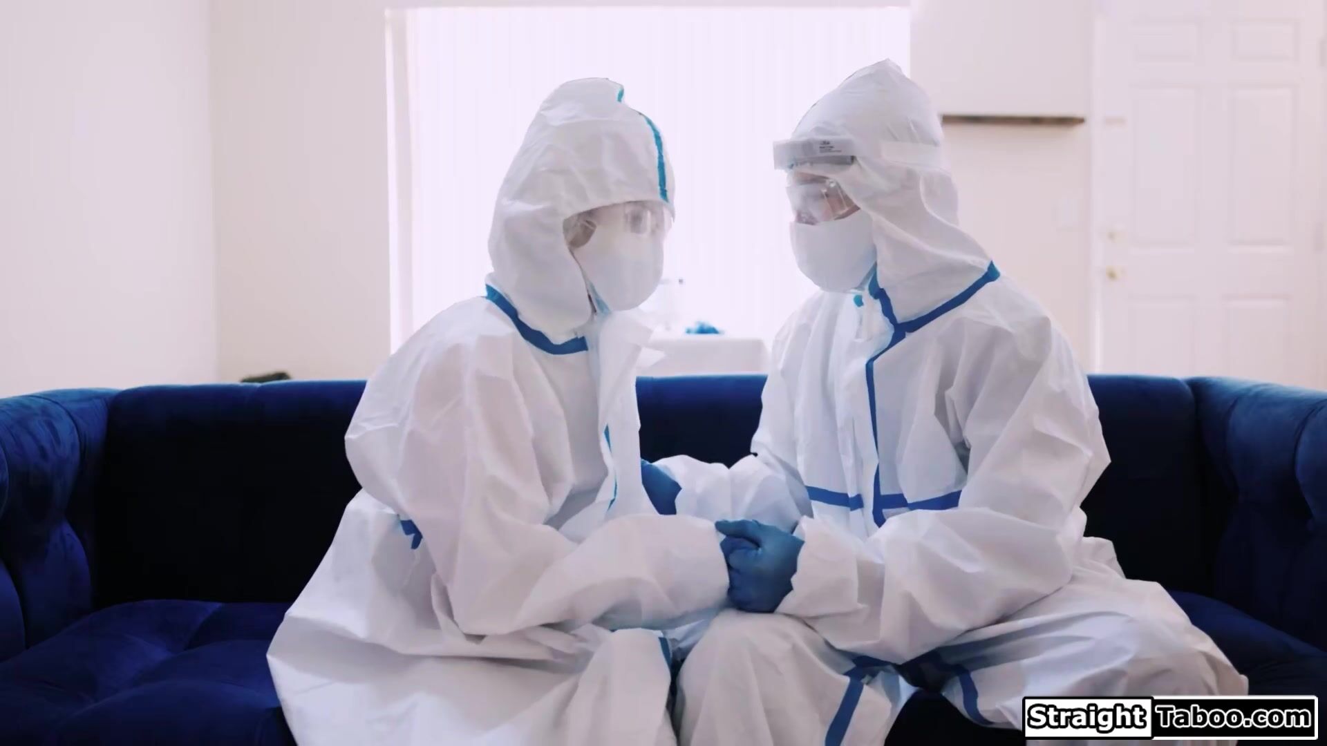 Lola Fae and her bf wear protective clothing due to the pandemic.They are still horny and the small tits babe starts to masturbate while he jerks off his hard cock.The petite blonde gives him a footjob and bends over to get doggystyle fucked