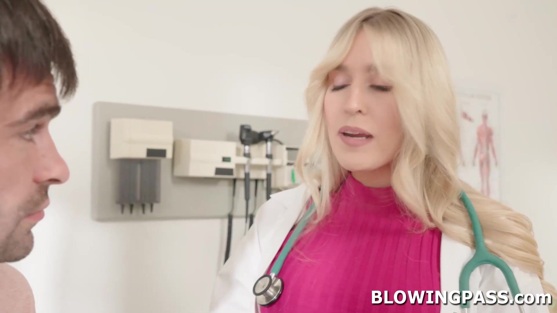 Doctor Sarah Taylor addresses her patients sex problems.She gets him hard by letting him touch her big tits.The busty blonde milf is doing handjob,later on she gets naked,removes her lingerie and goes down sucking and deepthroating his big cock.
