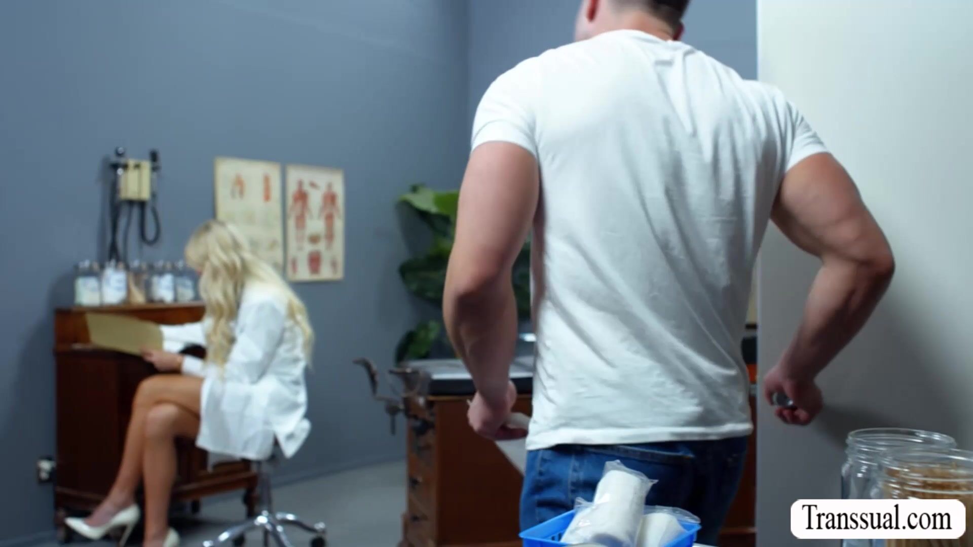 Blonde Trans Doctor fall in love in her stud patient.She lets him suck her hard shecock passionately and in return,she fucks his tight wet asshole so deep and hard.Go to Transsual.com to watch the full video and more like this.