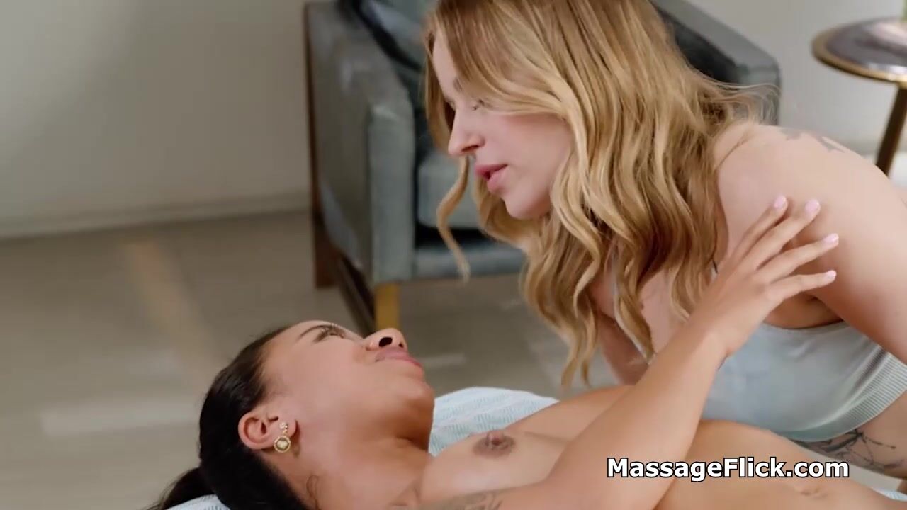 Thick blonde masseuse Anna meets her new client who is a super hot ebony babe. She wants to know her better and maybe scissor with her juicy pussy!